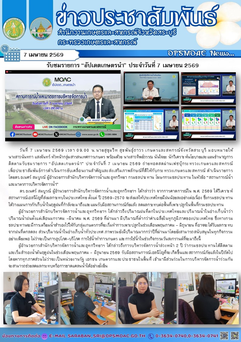 วันที่ 7 เมษายน 2569 เวลา 09.00 น.นายสุขุมวิท สุขพันธุ์ถาวร เกษตรและสหกรณ์จังหวัดสระบุรี มอบหมายให้ นางสาวนันทกา แสงจันทร์ หัวหน้ากลุ่มสารสนเทศการเกษตร พร้อมด้วย นางสาวทิพย์วรรณ นันใจยะ นักวิเคราะห์นโยบายและแผนชำนาญการ ติดตามรับชมรายการ “อัปเดตเกษตรนำ” ประจำวันที่ 7 เมษายน 2569 ถ่ายทอดสดผ่านเฟซบุ๊กระทรวงเกษตรและสหกรณ์เพื่อประชาสัมพันธ์การดำเนินการขับเคลื่อนงานสำคัญและส่งเสริมภาพลักษณ์ที่ดีให้กับกระทรวงเกษตรและสหกรณ์ ดำเนินรายการ โดยดร.ธเนศร์ สมบูรณ์ ผู้อำนวยการสำนักบริหารจัดการน้ำและอุทกวิทยา กรมชลประทาน โฆษกกรมชลประทาน ในหัวข้อ “สถานการณ์น้ำและมาตรการบริหารจัดการน้ำ”