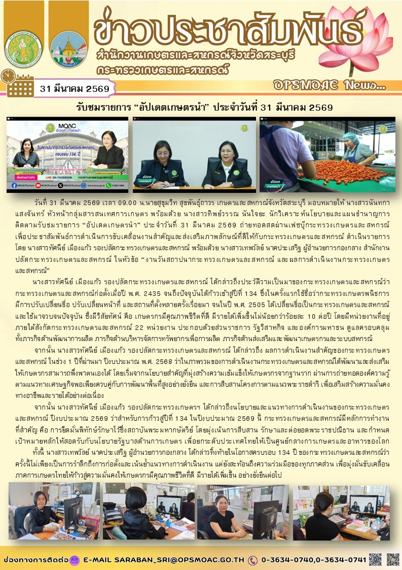 วันที่ 31 มีนาคม 2569 เวลา 09.00 น.นายสุขุมวิท สุขพันธุ์ถาวร เกษตรและสหกรณ์จังหวัดสระบุรี มอบหมายให้ นางสาวนันทกา แสงจันทร์ หัวหน้ากลุ่มสารสนเทศการเกษตร พร้อมด้วย นางสาวทิพย์วรรณ นันใจยะ นักวิเคราะห์นโยบายและแผนชำนาญการ ติดตามรับชมรายการ “อัปเดตเกษตรนำ” ประจำวันที่ 31 มีนาคม 2569 ถ่ายทอดสดผ่านเฟซบุ๊กระทรวงเกษตรและสหกรณ์เพื่อประชาสัมพันธ์การดำเนินการขับเคลื่อนงานสำคัญและส่งเสริมภาพลักษณ์ที่ดีให้กับกระทรวงเกษตรและสหกรณ์ ดำเนินรายการ โดย นางสาวทัศนีย์ เมืองแก้ว รองปลัดกระทรวงเกษตรและสหกรณ์ พร้อมด้วย นางสาวเทพวัลย์ นาคประเสริฐ ผู้อำนวยการกองกลาง สำนักงานปลัดกระทรวงเกษตรและสหกรณ์ ในหัวข้อ “งานวันสถาปนากระทรวงเกษตรและสหกรณ์ และผลการดำเนินงานกระทรวงเกษตรและสหกรณ์”