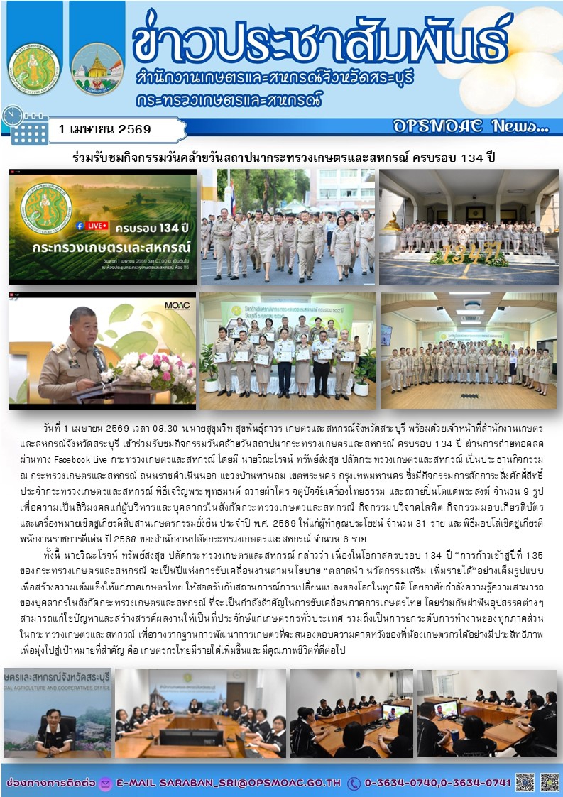 วันที่ 1 เมษายน 2569 เวลา 08.30 น.นายสุขุมวิท สุขพันธุ์ถาวร เกษตรและสหกรณ์จังหวัดสระบุรี พร้อมด้วยเจ้าหน้าที่สำนักงานเกษตรและสหกรณ์จังหวัดสระบุรี เข้าร่วมรับชมกิจกรรมวันคล้ายวันสถาปนากระทรวงเกษตรและสหกรณ์ ครบรอบ 134 ปี ผ่านการถ่ายทอดสด ผ่านทาง Facebook Live กระทรวงเกษตรและสหกรณ์ โดยมี นายวิณะโรจน์ ทรัพย์ส่งสุข ปลัดกระทรวงเกษตรและสหกรณ์ เป็นประธานกิจกรรม ณ กระทรวงเกษตรและสหกรณ์ ถนนราชดำเนินนอก แขวงบ้านพานถม เขตพระนคร กรุงเทพมหานคร ซึ่งมีกิจกรรมการสักการะสิ่งศักดิ์สิทธิ์