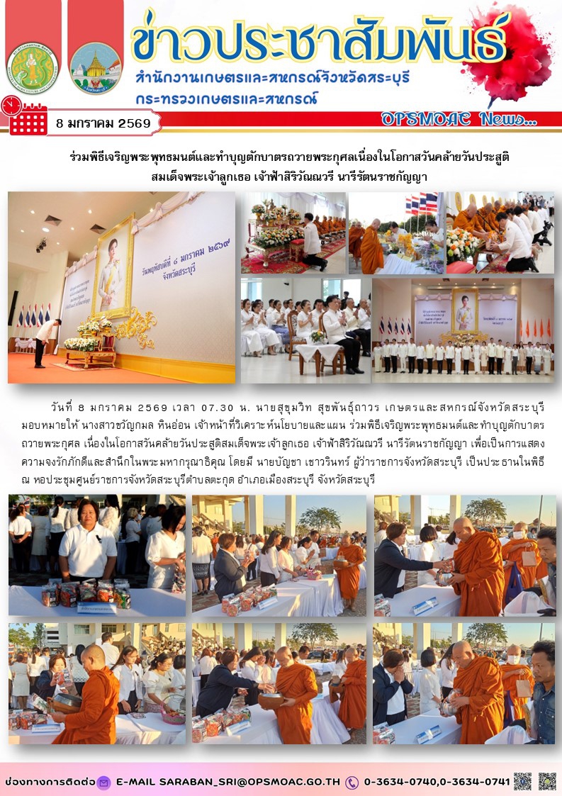 วันที่ 8 มกราคม 2569 เวลา 07.30 น. นายสุขุมวิท สุขพันธุ์ถาวร เกษตรและสหกรณ์จังหวัดสระบุรี มอบหมายให้ นางสาวขวัญกมล หินอ่อน เจ้าหน้าที่วิเคราะห์นโยบายและแผน ร่วมพิธีเจริญพระพุทธมนต์และทำบุญตักบาตรถวายพระกุศล เนื่องในโอกาสวันคล้ายวันประสูติสมเด็จพระเจ้าลูกเธอ เจ้าฟ้าสิริวัณณวรี นารีรัตนราชกัญญา เพื่อเป็นการแสดงความจงรักภักดีและสำนึกในพระมหากรุณาธิคุณ โดยมี นายบัญชา เชาวรินทร์ ผู้ว่าราชการจังหวัดสระบุรี เป็นประธานในพิธี ณ หอประชุมศูนย์ราชการจังหวัดสระบุรีตำบลตะกุด อำเภอเมืองสระบุรี จังหวัดสระบุรี
