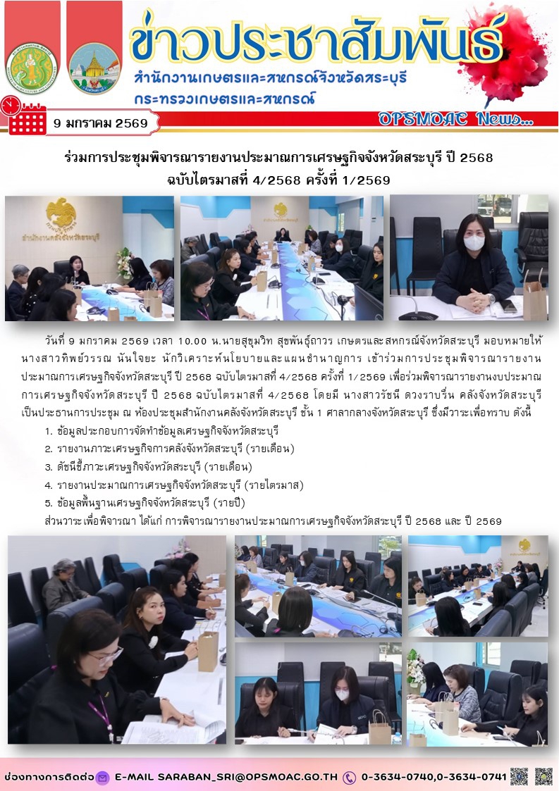 วันที่ 9 มกราคม 2569 เวลา 10.00 น.นายสุขุมวิท สุขพันธุ์ถาวร เกษตรและสหกรณ์จังหวัดสระบุรี มอบหมายให้ นางสาวทิพย์วรรณ นันใจยะ นักวิเคราะห์นโยบายและแผนชำนาญการ เข้าร่วมการประชุมพิจารณารายงานประมาณการเศรษฐกิจจังหวัดสระบุรี ปี 2568 ฉบับไตรมาสที่ 4/2568 ครั้งที่ 1/2569 เพื่อร่วมพิจารณารายงานงบประมาณการเศรษฐกิจจังหวัดสระบุรี ปี 2568 ฉบับไตรมาสที่ 4/2568 โดยมี นางสาวรัชนี ดวงราบรื่น คลังจังหวัดสระบุรี เป็นประธานการประชุม ณ ห้องประชุมสำนักงานคลังจังหวัดสระบุรี ชั้น 1 ศาลากลางจังหวัดสระบุรี ซึ่งมีวาระเพื่อทราบ ดังนี้