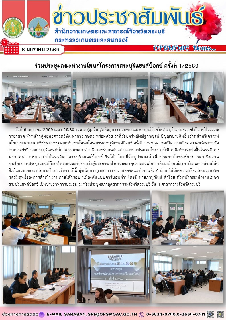 วันที่ 6 มกราคม 2569 เวลา 09.30 น.นายสุขุมวิท สุขพันธุ์ถาวร เกษตรและสหกรณ์จังหวัดสระบุรี มอบหมายให้ นางวิไลวรรณ กายาผาด หัวหน้ากลุ่มยุทธศาสตร์พัฒนาการเกษตร พร้อมด้วย ว่าที่ร้อยตรีหญิงณัฐกาญจน์ ปัญญาประสิทธิ์ เจ้าหน้าที่วิเคราะห์นโยบายและแผน เข้าร่วมประชุมคณะทำงานโฆษกโครงการสระบุรีแซนด์บ็อกซ์ ครั้งที่ 1/2569 เพื่อเป็นการเตรียมความพร้อมการจัดงานประจำปี "วันสระบุรีแซนด์บ็อกซ์ รวมพลังสร้างเมืองคาร์บอนต่ำแห่งแรกของประเทศไทย" ครั้งที่ 2 ซึ่งกำหนดจัดขึ้นในวันที่ 22 มกราคม 2569 ภายใต้แนวคิด "สระบุรีแซนด์บ็อกซ์ กินได้" โดยมีวัตถุประสงค์ เพื่อประชาสัมพันธ์ผลการดำเนินงาน ของโครงการสระบุรีแซนด์บ็อกซ์ ตลอดจนสร้างการรับรู้และการมีส่วนร่วมของทุกภาคส่วนในการขับเคลื่อนเมืองคาร์บอนต่ำอย่างยั่งยืน
