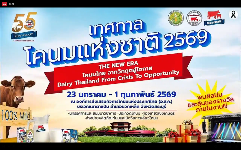 ทั้งนี้ นางสาววัชรี วรรณศรี ผู้อำนวยการองค์การส่งเสริมกิจการโคนมแห่งประเทศไทยฯ ได้กล่าวประชาสัมพันธ์เชิญชวนประชาชน เข้าร่วมงานเทศกาล โคนมแห่งชาติ ประจำปี 2569 ณ บริเวณเขาตาแป้น องค์การส่งเสริมกิจการโคนมแห่งประเทศไทย (อ.ส.ค.) อำเภอมวกเหล็ก จังหวัดสระบุรี ในระหว่าง วันที่ 23 มกราคม - 1 กุมภาพันธ์ พ.ศ. 2569 เป็นต้นไป