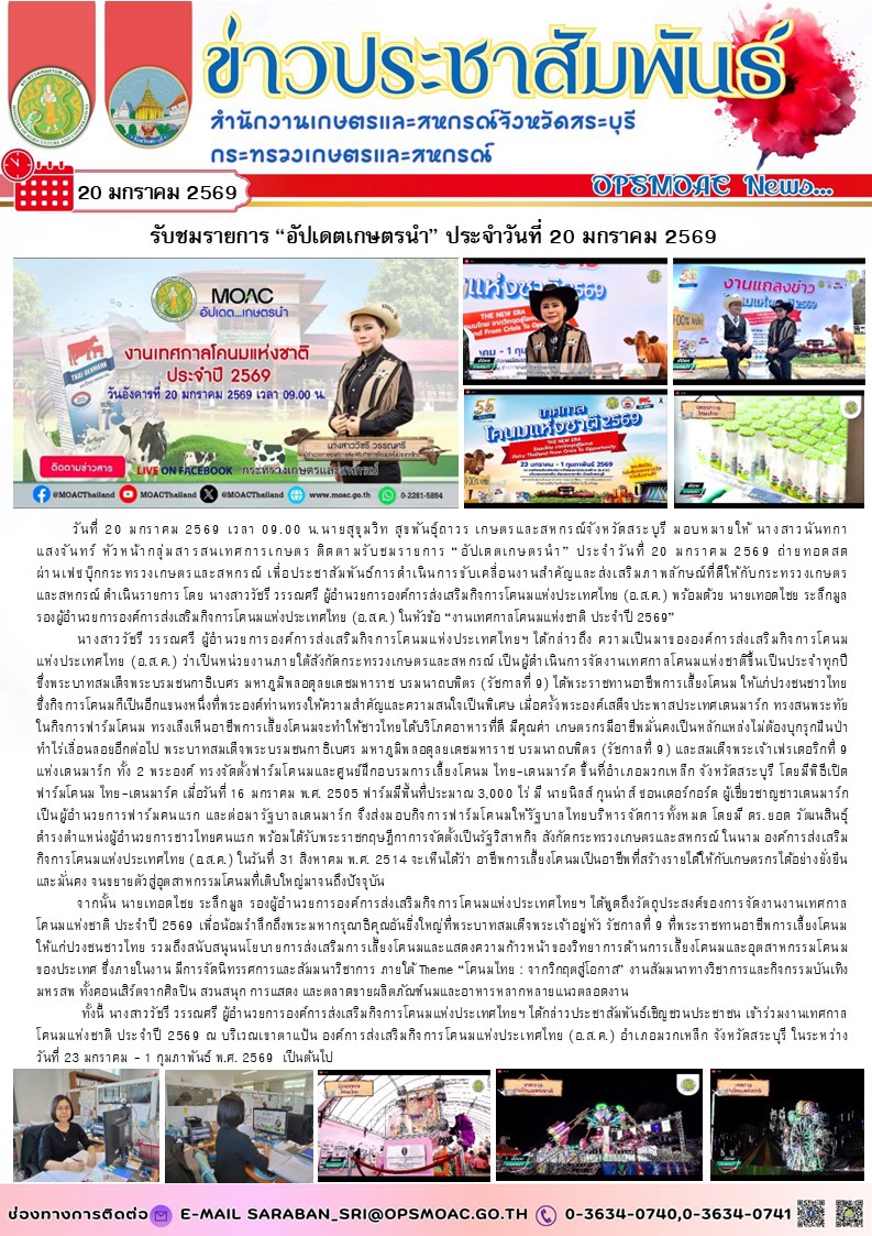 วันที่ 20 มกราคม 2569 เวลา 09.00 น.นายสุขุมวิท สุขพันธุ์ถาวร เกษตรและสหกรณ์จังหวัดสระบุรี มอบหมายให้ นางสาวนันทกา แสงจันทร์ หัวหน้ากลุ่มสารสนเทศการเกษตร ติดตามรับชมรายการ “อัปเดตเกษตรนำ” ประจำวันที่ 20 มกราคม 2569 ถ่ายทอดสด ผ่านเฟซบุ๊กกระทรวงเกษตรและสหกรณ์ เพื่อประชาสัมพันธ์การดำเนินการขับเคลื่อนงานสำคัญและส่งเสริมภาพลักษณ์ที่ดีให้กับกระทรวงเกษตรและสหกรณ์ ดำเนินรายการ โดย นางสาววัชรี วรรณศรี ผู้อำนวยการองค์การส่งเสริมกิจการโคนมแห่งประเทศไทย (อ.ส.ค.) พร้อมด้วย นายเทอดไชย ระลึกมูล รองผู้อำนวยการองค์การส่งเสริมกิจการโคนมแห่งประเทศไทย (อ.ส.ค.) ในหัวข้อ “งานเทศกาลโคนมแห่งชาติ ประจำปี 2569”