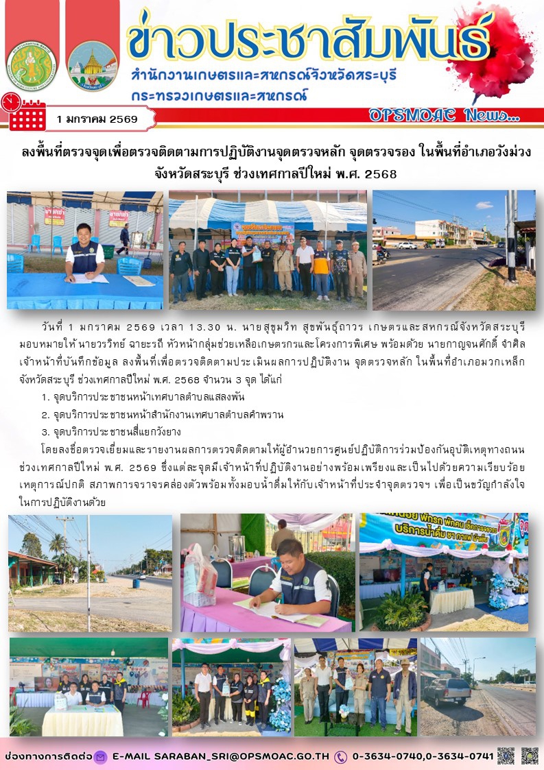 วันที่ 1 มกราคม 2569 เวลา 13.30 น. นายสุขุมวิท สุขพันธุ์ถาวร เกษตรและสหกรณ์จังหวัดสระบุรี มอบหมายให้ นายวรวิทย์ ฉายะรถี หัวหน้ากลุ่มช่วยเหลือเกษตรกรและโครงการพิเศษ พร้อมด้วย นายกาญจนศักดิ์ จำศิล เจ้าหน้าที่บันทึกข้อมูล ลงพื้นที่เพื่อตรวจติดตามประเมินผลการปฏิบัติงาน จุดตรวจหลัก ในพื้นที่อำเภอมวกเหล็กจังหวัดสระบุรี ช่วงเทศกาลปีใหม่ พ.ศ. 2568 จำนวน 3 จุด ได้แก่