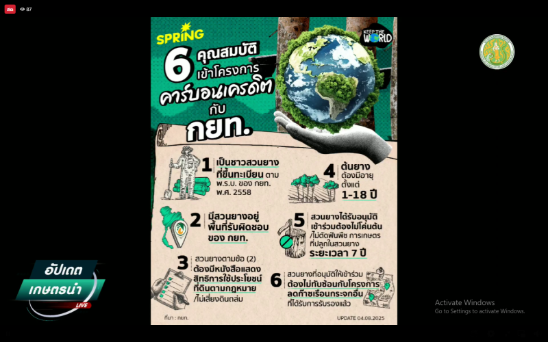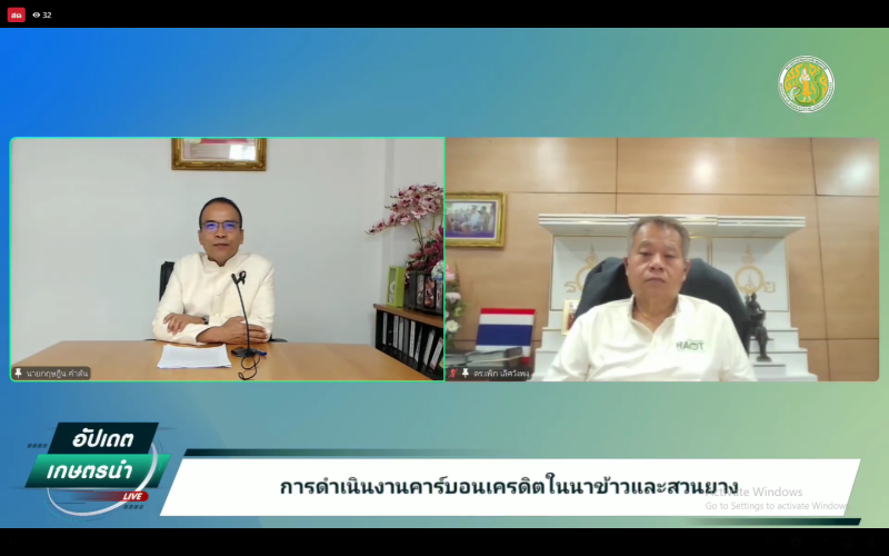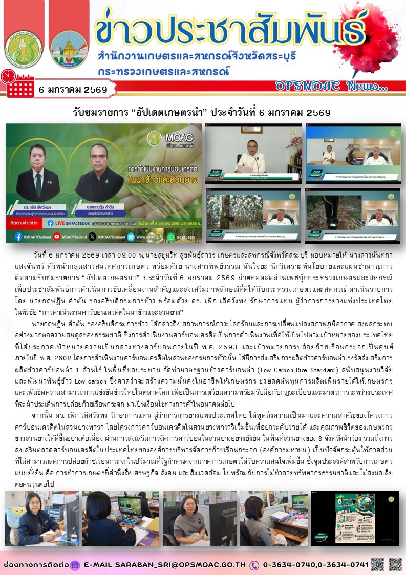 วันที่ 6 มกราคม 2569 เวลา 09.00 น.นายสุขุมวิท สุขพันธุ์ถาวร เกษตรและสหกรณ์จังหวัดสระบุรี มอบหมายให้ นางสาวนันทกา แสงจันทร์ หัวหน้ากลุ่มสารสนเทศการเกษตร พร้อมด้วย นางสาวทิพย์วรรณ นันใจยะ นักวิเคราะห์นโยบายและแผนชำนาญการ ติดตามรับชมรายการ “อัปเดตเกษตรนำ” ประจำวันที่ 6 มกราคม 2569 ถ่ายทอดสดผ่านเฟซบุ๊กกระทรวงเกษตรและสหกรณ์ เพื่อประชาสัมพันธ์การดำเนินการขับเคลื่อนงานสำคัญและส่งเสริมภาพลักษณ์ที่ดีให้กับกระทรวงเกษตรและสหกรณ์ ดำเนินรายการ โดย นายกฤษฎิน คำตัน รองอธิบดีกรมการข้าว พร้อมด้วย ดร. เพิก เลิศวังพง รักษาการแทน ผู้ว่าการการยางแห่งประเทศไทย ในหัวข้อ “การดำเนินงานคาร์บอนเครดิตในนาข้าวและสวนยาง”