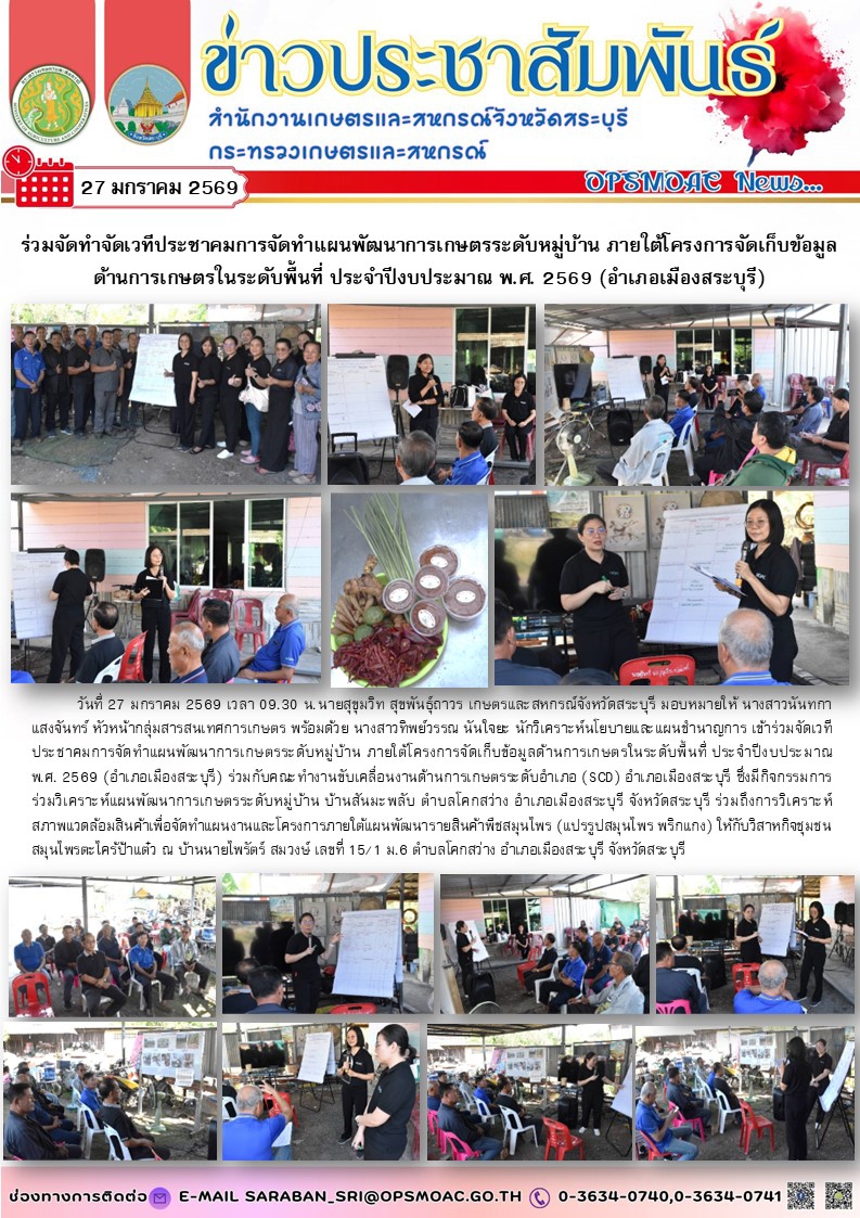 วันที่ 27 มกราคม 2569 เวลา 09.30 น.นายสุขุมวิท สุขพันธุ์ถาวร เกษตรและสหกรณ์จังหวัดสระบุรี มอบหมายให้ นางสาวนันทกา แสงจันทร์ หัวหน้ากลุ่มสารสนเทศการเกษตร พร้อมด้วย นางสาวทิพย์วรรณ นันใจยะ นักวิเคราะห์นโยบายและแผนชำนาญการ เข้าร่วมจัดเวทีประชาคมการจัดทำแผนพัฒนาการเกษตรระดับหมู่บ้าน ภายใต้โครงการจัดเก็บข้อมูลด้านการเกษตรในระดับพื้นที่ ประจำปีงบประมาณ พ.ศ. 2569 (อำเภอเมืองสระบุรี) ร่วมกับคณะทำงานขับเคลื่อนงานด้านการเกษตรระดับอำเภอ (SCD) อำเภอเมืองสระบุรี ซึ่งมีกิจกรรมการร่วมวิเคราะห์แผนพัฒนาการเกษตรระดับหมู่บ้าน บ้านสันมะพลับ ตำบลโคกสว่าง อำเภอเมืองสระบุรี จังหวัดสระบุรี ร่วมถึงการวิเคราะห์สภาพแวดล้อมสินค้าเพื่อจัดทำแผนงานและโครงการภายใต้แผนพัฒนารายสินค้าพืชสมุนไพร (แปรรูปสมุนไพร พริกแกง) ให้กับวิสาหกิจชุมชนสมุนไพรตะไคร้ป้าแต๋ว ณ บ้านนายไพรัตร์ สมวงษ์ เลขที่ 15/1 ม.6 ตำบลโคกสว่าง อำเภอเมืองสระบุรี จังหวัดสระบุรี