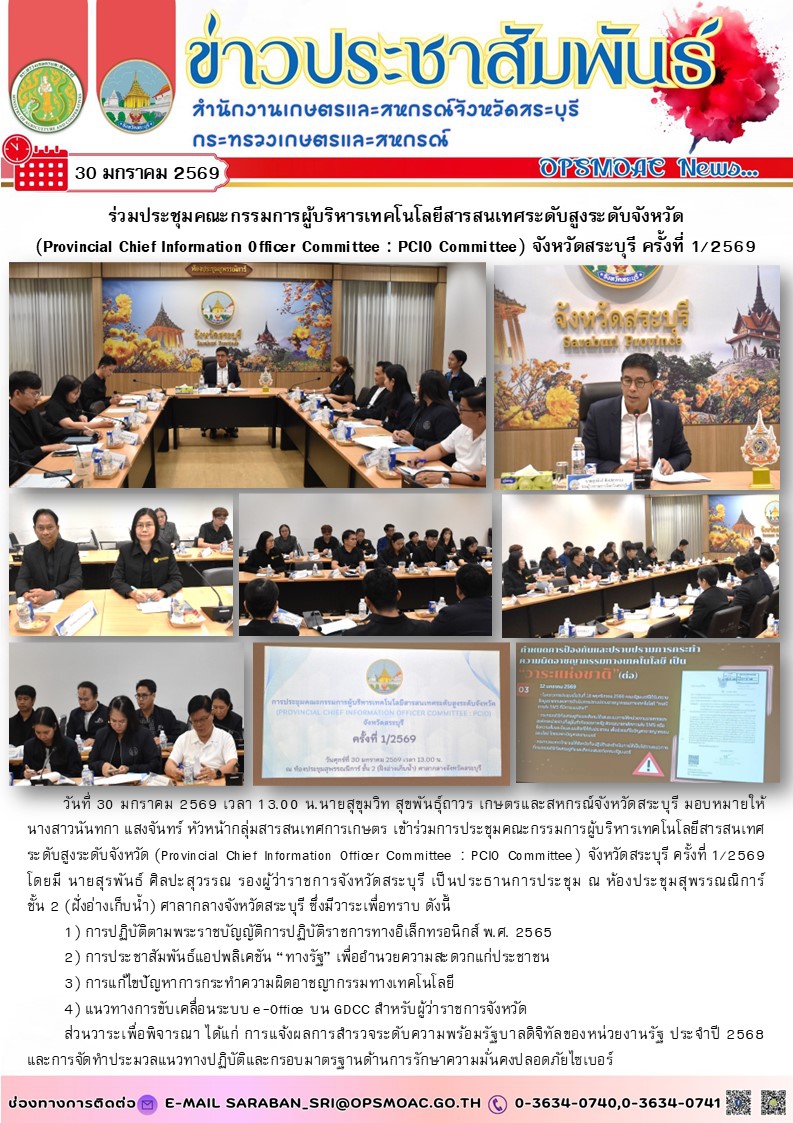 วันที่ 30 มกราคม 2569 เวลา 13.00 น.นายสุขุมวิท สุขพันธุ์ถาวร เกษตรและสหกรณ์จังหวัดสระบุรี มอบหมายให้ นางสาวนันทกา แสงจันทร์ หัวหน้ากลุ่มสารสนเทศการเกษตร เข้าร่วมการประชุมคณะกรรมการผู้บริหารเทคโนโลยีสารสนเทศระดับสูงระดับจังหวัด (Provincial Chief Information Officer Committee : PCIO Committee) จังหวัดสระบุรี ครั้งที่ 1/2569