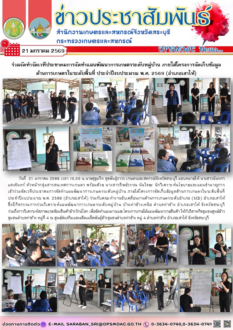 วันที่ 21 มกราคม 2569 เวลา 10.00 น.นายสุขุมวิท สุขพันธุ์ถาวร เกษตรและสหกรณ์จังหวัดสระบุรี มอบหมายให้ นางสาวนันทกา แสงจันทร์ หัวหน้ากลุ่มสารสนเทศการเกษตร พร้อมด้วย นางสาวทิพย์วรรณ นันใจยะ นักวิเคราะห์นโยบายและแผนชำนาญการ เข้าร่วมจัดเวทีประชาคมการจัดทำแผนพัฒนาการเกษตรระดับหมู่บ้าน ภายใต้โครงการจัดเก็บข้อมูลด้านการเกษตรในระดับพื้นที่ ประจำปีงบประมาณ พ.ศ. 2569 (อำเภอเสาไห้) ร่วมกับคณะทำงานขับเคลื่อนงานด้านการเกษตรระดับอำเภอ (SCD) อำเภอเสาไห้ ซึ่งมีกิจกรรมการร่วมวิเคราะห์แผนพัฒนาการเกษตรระดับหมู่บ้าน บ้านท่าช้างเหนือ ตำบลท่าช้าง อำเภอเสาไห้ จังหวัดสระบุรี ร่วมถึงการวิเคราะห์สภาพแวดล้อมสินค้าข้าวรักษ์โลก เพื่อจัดทำแผนงานและโครงการภายใต้แผนพัฒนารายสินค้ให้กับวิสาหกิจชุมชนศูนย์ข้าวชุมชนตำบลท่าช้าง หมู่ที่ 4 ณ ศูนย์ส่งเสริมและผลิตเมล็ดพันธุ์ข้าวชุมชนตำบลท่าช้าง หมู่ 4 ตำบลท่าช้าง อำเภอเสาไห้ จังหวัดสระบุรี