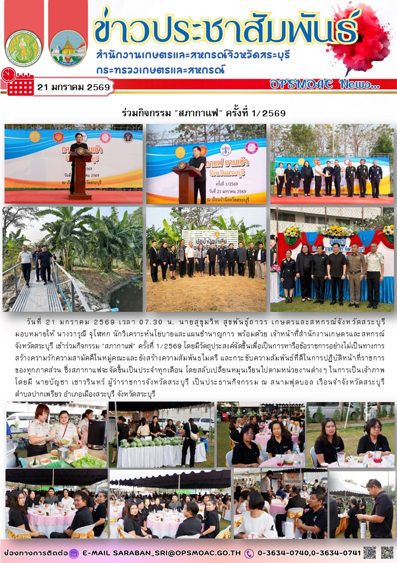 วันที่ 21 มกราคม 2569 เวลา 07.30 น. นายสุขุมวิท สุขพันธุ์ถาวร เกษตรและสหกรณ์จังหวัดสระบุรี มอบหมายให้ นางวารุณี จุโฬทก นักวิเคราะห์นโยบายและแผนชำนาญการ พร้อมด้วย เจ้าหน้าที่สำนักงานเกษตรและสหกรณ์ จังหวัดสระบุรี เข้าร่วมกิจกรรม "สภากาแฟ" ครั้งที่ 1/2569 โดยมีวัตถุประสงค์จัดขึ้นเพื่อเป็นการหารือข้อราชการอย่างไม่เป็นทางการ สร้างความรักความสามัคคีในหมู่คณะและยังสร้างความสัมพันธไมตรี และกระชับความสัมพันธ์ที่ดีในการปฏิบัติหน้าที่ราชการ ของทุกภาคส่วน ซึ่งสภากาแฟจะจัดขึ้นเป็นประจำทุกเดือน โดยสลับเปลี่ยนหมุนเวียนไปตามหน่วยงานต่างๆ ในการเป็นเจ้าภาพ โดยมี นายบัญชา เชาวรินทร์ ผู้ว่าราชการจังหวัดสระบุรี เป็นประธานกิจกรรม ณ สนามฟุตบอล เรือนจำจังหวัดสระบุรี ตำบลปากเพรียว อำเภอเมืองสระบุรี จังหวัดสระบุรี