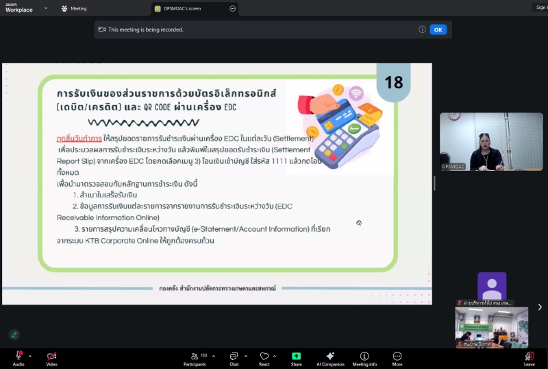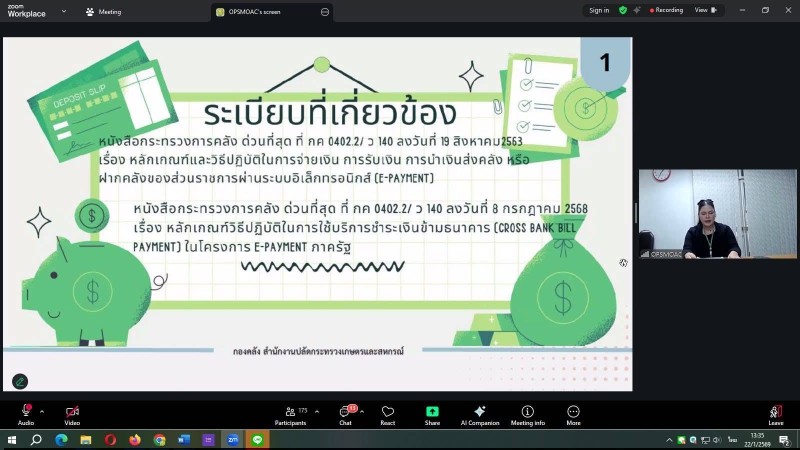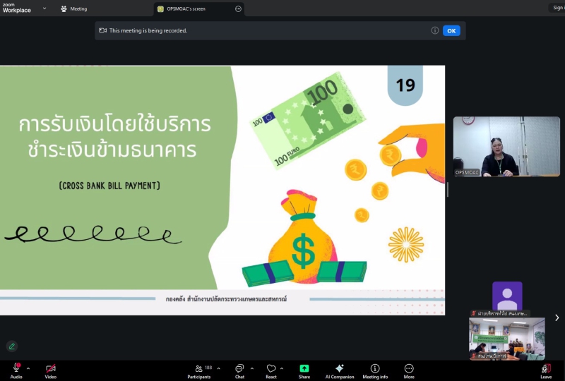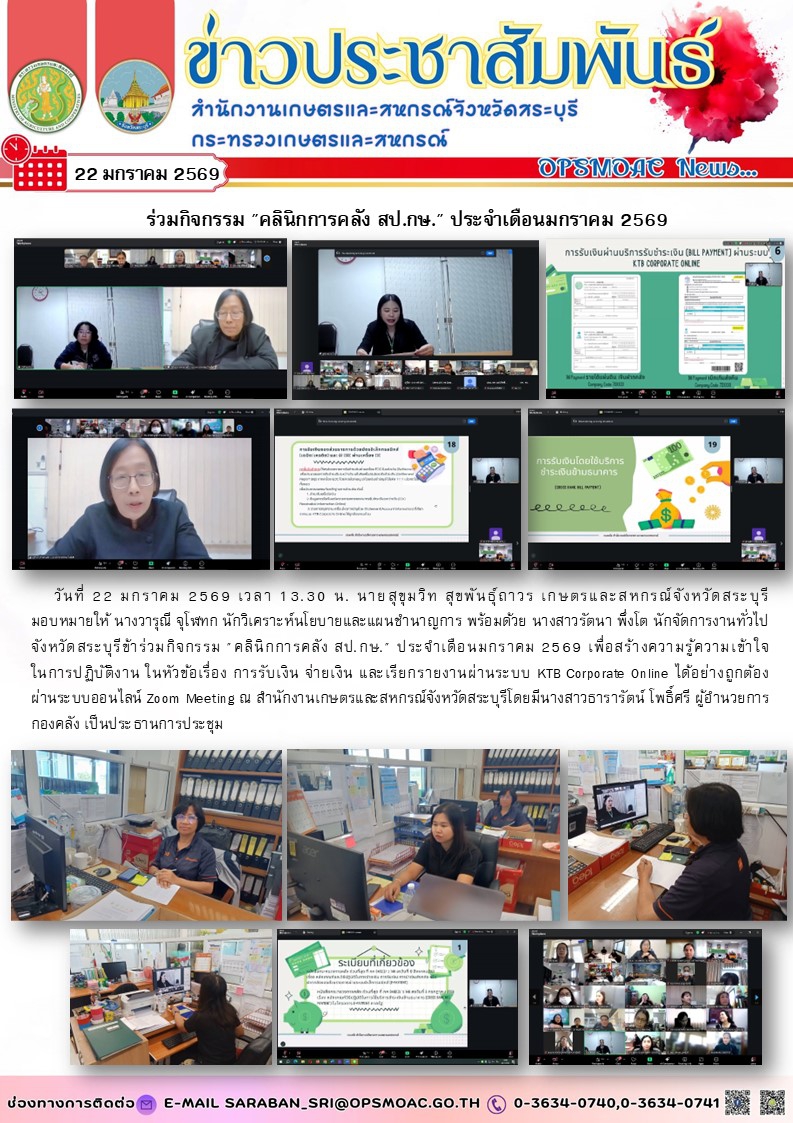 วันที่ 22 มกราคม 2569 เวลา 13.30 น. นายสุขุมวิท สุขพันธุ์ถาวร เกษตรและสหกรณ์จังหวัดสระบุรี มอบหมายให้ นางวารุณี จุโฬทก นักวิเคราะห์นโยบายและแผนชำนาญการ พร้อมด้วย นางสาวรัตนา พึ่งโต นักจัดการงานทั่วไป จังหวัดสระบุรีข้าร่วมกิจกรรม "คลินิกการคลัง สป.กษ." ประจำเดือนมกราคม 2569 เพื่อสร้างความรู้ความเข้าใจ ในการปฏิบัติงาน ในหัวข้อเรื่อง การรับเงิน จ่ายเงิน และเรียกรายงานผ่านระบบ KTB Corporate Online ได้อย่างถูกต้อง ผ่านระบบออนไลน์ Zoom Meeting ณ สำนักงานเกษตรและสหกรณ์จังหวัดสระบุรีโดยมีนางสาวธารารัตน์ โพธิ์ศรี ผู้อำนวยการกองคลัง เป็นประธานการประชุม
