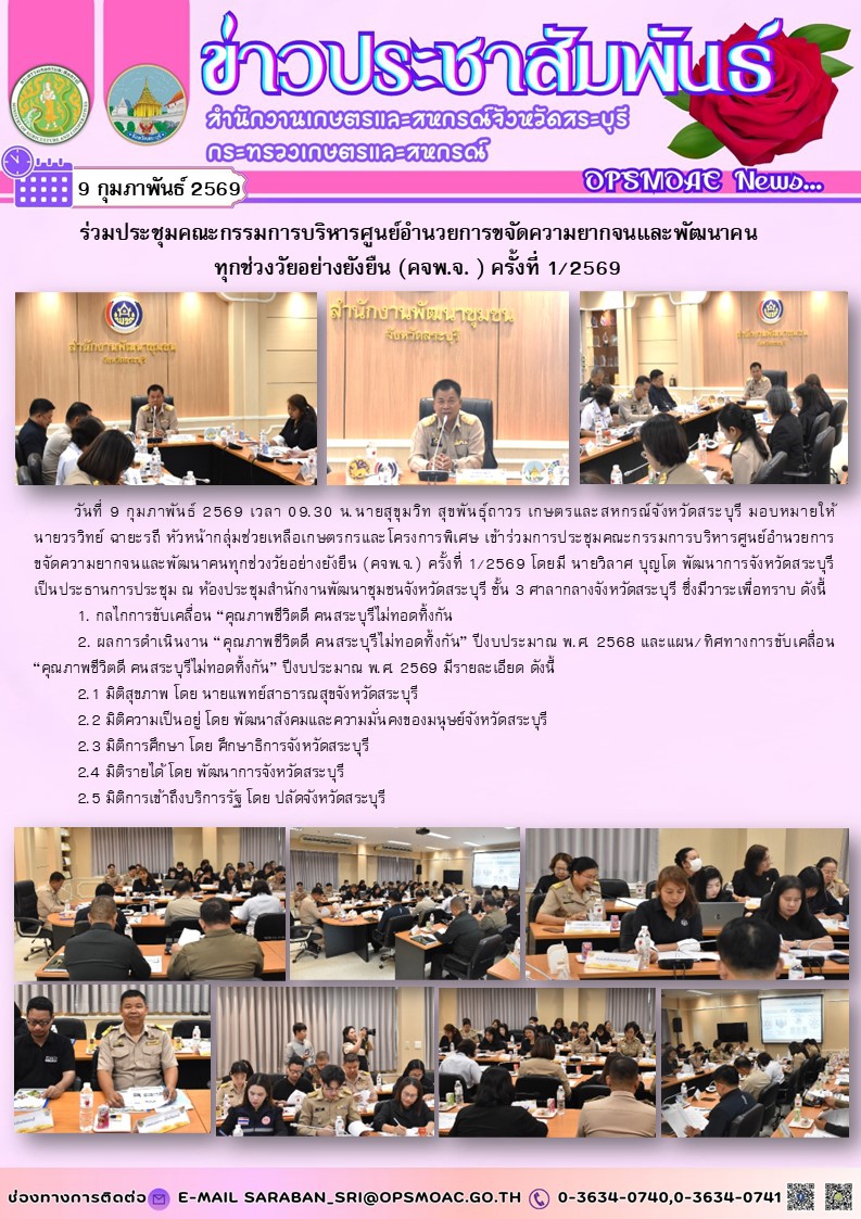 วันที่ 9 กุมภาพันธ์ 2569 เวลา 09.30 น.นายสุขุมวิท สุขพันธุ์ถาวร เกษตรและสหกรณ์จังหวัดสระบุรี มอบหมายให้ นายวรวิทย์ ฉายะรถี หัวหน้ากลุ่มช่วยเหลือเกษตรกรและโครงการพิเศษ เข้าร่วมการประชุมคณะกรรมการบริหารศูนย์อำนวยการ ขจัดความยากจนและพัฒนาคนทุกช่วงวัยอย่างยังยืน (คจพ.จ.) ครั้งที่ 1/2569 โดยมี นายวิลาศ บุญโต พัฒนาการจังหวัดสระบุรี