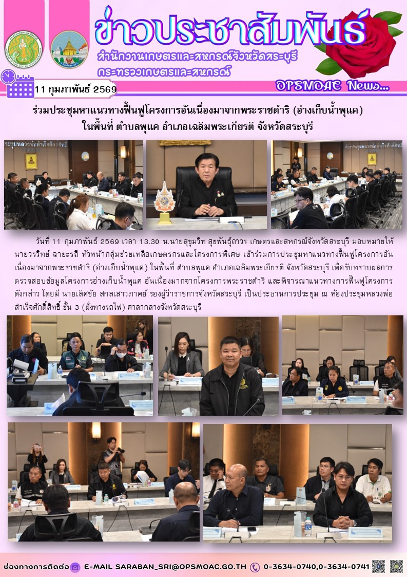 วันที่ 11 กุมภาพันธ์ 2569 เวลา 13.30 น.นายสุขุมวิท สุขพันธุ์ถาวร เกษตรและสหกรณ์จังหวัดสระบุรี มอบหมายให้ นายวรวิทย์ ฉายะรถี หัวหน้ากลุ่มช่วยเหลือเกษตรกรและโครงการพิเศษ เข้าร่วมการประชุมหาแนวทางฟื้นฟูโครงการอันเนื่องมาจากพระราชดำริ (อ่างเก็บน้ำพุแค) ในพื้นที่ ตำบลพุแค อำเภอเฉลิมพระเกียรติ จังหวัดสระบุรี เพื่อรับทราบผลการตรวจสอบข้อมูลโครงการอ่างเก็บน้ำพุแค อันเนื่องมากจากโครงการพระราชดำริ และพิจารณาแนวทางการฟื้นฟูโครงการดังกล่าว โดยมี นายเลิศชัย สกลเสาวภาคย์ รองผู้ว่าราชการจังหวัดสระบุรี เป็นประธานการประชุม ณ ห้องประชุมหลวงพ่อสำเร็จศักดิ์สิทธิ์ ชั้น 3 (ฝั่งทางรถไฟ) ศาลากลางจังหวัดสระบุรี