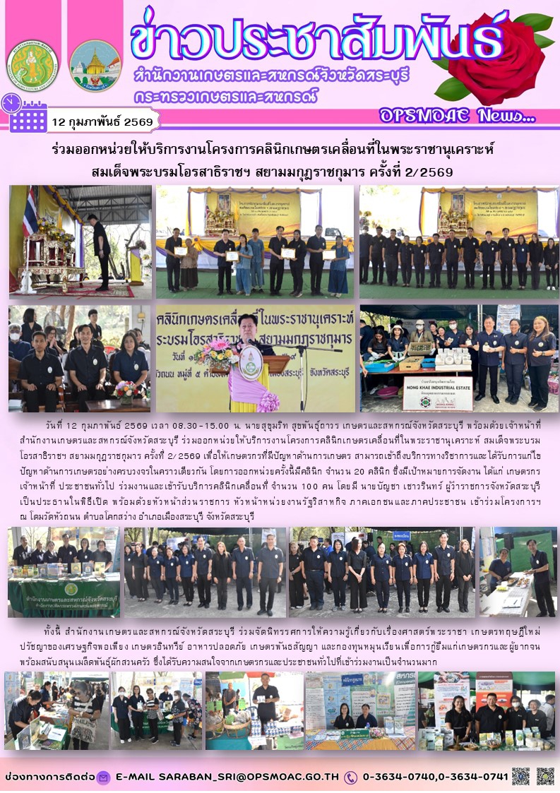 วันที่ 12 กุมภาพันธ์ 2569 เวลา 08.30-15.00 น. นายสุขุมวิท สุขพันธุ์ถาวร เกษตรและสหกรณ์จังหวัดสระบุรี พร้อมด้วยเจ้าหน้าที่สำนักงานเกษตรและสหกรณ์จังหวัดสระบุรี ร่วมออกหน่วยให้บริการงานโครงการคลินิกเกษตรเคลื่อนที่ในพระราชานุเคราะห์ สมเด็จพระบรม โอรสาธิราชฯ สยามมกุฎราชกุมาร ครั้งที่ 2/2569 เพื่อให้เกษตรกรที่มีปัญหาด้านการเกษตร สามารถเข้าถึงบริการทางวิชาการและได้รับการแก้ไขปัญหาด้านการเกษตรอย่างครบวงจรในคราวเดียวกัน โดยการออกหน่วยครั้งนี้มีคลินิก จำนวน 20 คลินิก ซึ่งมีเป้าหมายการจัดงาน ได้แก่ เกษตรกร เจ้าหน้าที่ ประชาชนทั่วไป ร่วมงานและเข้ารับบริการคลินิกเคลื่อนที่ จำนวน 100 คน โดยมี นายบัญชา เชาวรินทร์ ผู้ว่าราชการจังหวัดสระบุรี เป็นประธานในพิธีเปิด พร้อมด้วยหัวหน้าส่วนราชการ หัวหน้าหน่วยงานรัฐวิสาหกิจ ภาคเอกชนและภาคประชาชน เข้าร่วมโครงการฯ ณ โดมวัดหัวถนน ตำบลโคกสว่าง อำเภอเมืองสระบุรี จังหวัดสระบุรี