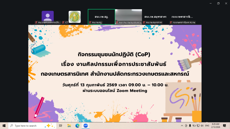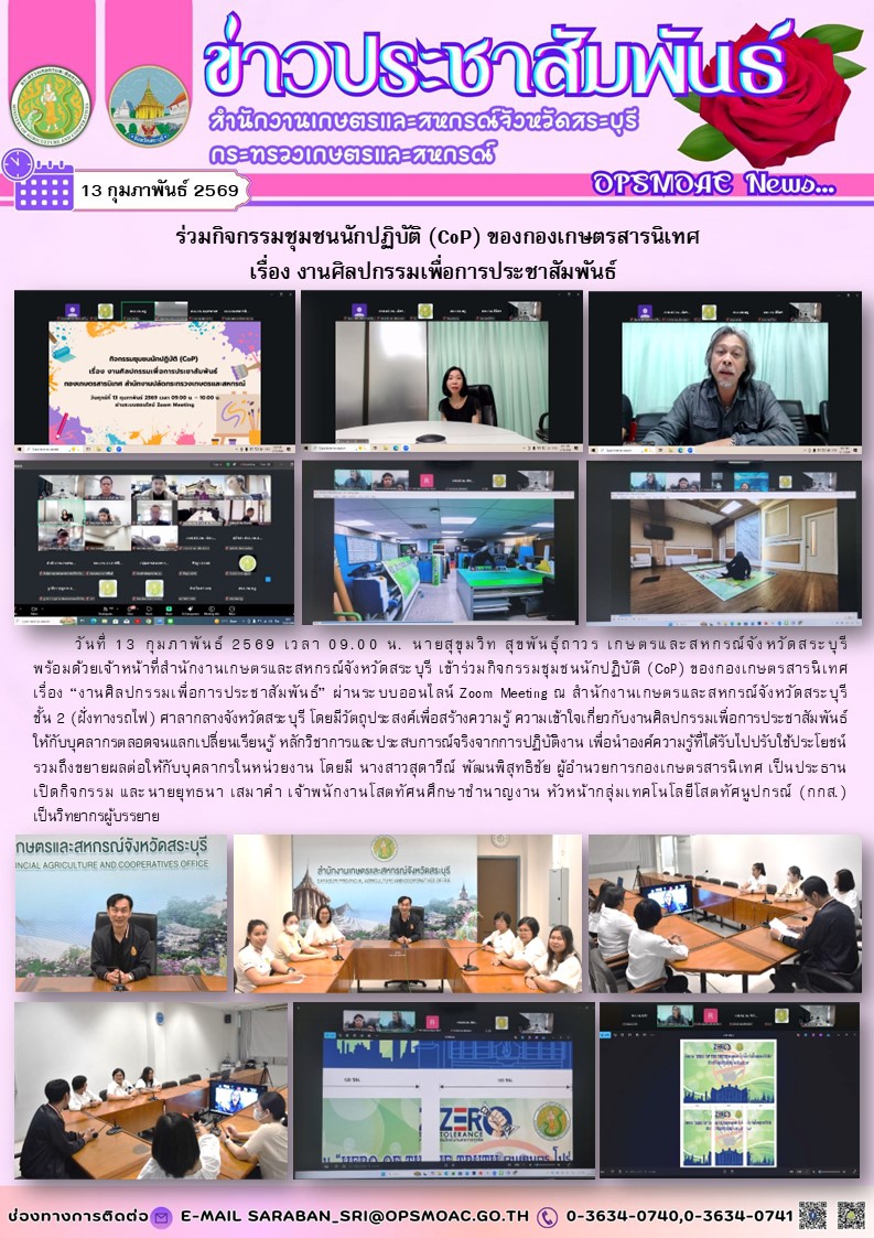 วันที่ 13 กุมภาพันธ์ 2569 เวลา 09.00 น. นายสุขุมวิท สุขพันธุ์ถาวร เกษตรและสหกรณ์จังหวัดสระบุรี พร้อมด้วยเจ้าหน้าที่สำนักงานเกษตรและสหกรณ์จังหวัดสระบุรี เข้าร่วมกิจกรรมชุมชนนักปฏิบัติ (CoP) ของกองเกษตรสารนิเทศ เรื่อง “งานศิลปกรรมเพื่อการประชาสัมพันธ์” ผ่านระบบออนไลน์ Zoom Meeting ณ สำนักงานเกษตรและสหกรณ์จังหวัดสระบุรี ชั้น 2 (ฝั่งทางรถไฟ) ศาลากลางจังหวัดสระบุรี โดยมีวัตถุประสงค์เพื่อสร้างความรู้ ความเข้าใจเกี่ยวกับงานศิลปกรรมเพื่อการประชาสัมพันธ์ ให้กับบุคลากรตลอดจนแลกเปลี่ยนเรียนรู้ หลักวิชาการแลประสบการณ์จริงจากการปฏิบัติงาน เพื่อนำองค์ความรู้ที่ได้รับไปปรับใช้ประโยชน์ รวมถึงขยายผลต่อให้กับบุคลากรในหน่วยงาน โดยมี นางสาวสุดาวีณ์ พัฒนพิสุทธิชัย ผู้อำนวยการกองเกษตรสารนิเทศ เป็นประธาน เปิดกิจกรรม และนายยุทธนา เสมาคำ เจ้าพนักงานโสตทัศนศึกษาชำนาญงาน หัวหน้ากลุ่มเทคโนโลยีโสตทัศนูปกรณ์ (กกส.) เป็นวิทยากรผู้บรรยาย