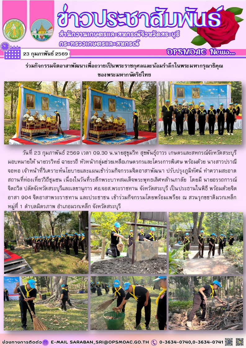 วันที่ 23 กุมภาพันธ์ 2569 เวลา 09.30 น.นายสุขุมวิท สุขพันธุ์ถาวร เกษตรและสหกรณ์จังหวัดสระบุรี มอบหมายให้ นายวรวิทย์ ฉายะรถี หัวหน้ากลุ่มช่วยเหลือเกษตรกรและโครงการพิเศษ พร้อมด้วย นางสาวปราณี จอหอ เจ้าหน้าที่วิเคราะห์นโยบายและแผนเข้าร่วมกิจกรรมจิตอาสาพัฒนา ปรับปรุงภูมิทัศน์ ทำความสะอาดสถานที่ท่องเที่ยววิถีชุมชน เนื่องในวันที่ระลึกพระบาทสมเด็จพระพุทธเลิศหล้านภาลัย โดยมี นายอรรถการณ์ จิตถวิล ปลัดจังหวัดสระบุรีและเลขานุการ ศอ.จอส.พระราชทาน จังหวัดสระบุรี เป็นประธานในพิธี พร้อมด้วยจิตอาสา 904 จิตอาสาพระราชทาน และประชาชน เข้าร่วมกิจกรรมโดยพร้อมเพรียง ณ สวนรุกขชาติมวกเหล็ก หมู่ที่ 1 ตำบลมิตรภาพ อำเภอมวกเหล็ก จังหวัดสระบุรี