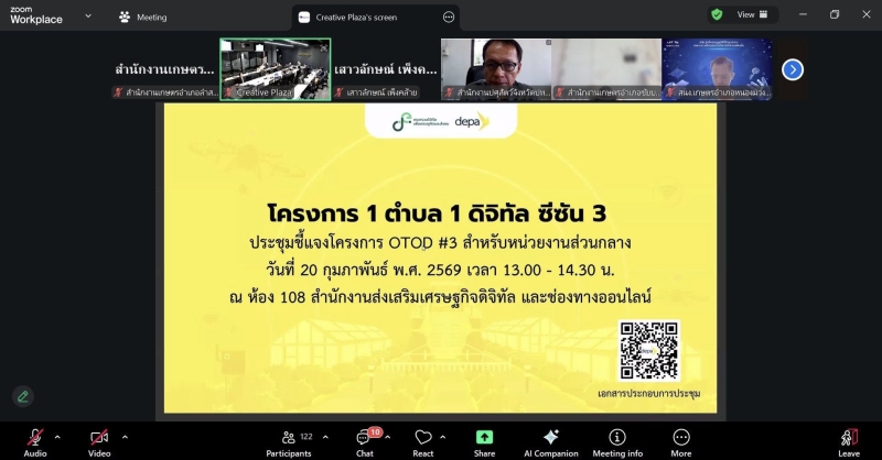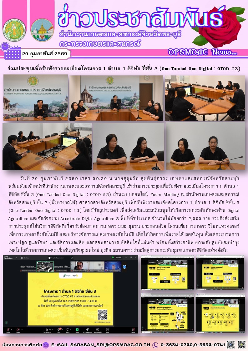 วันที่ 20 กุมภาพันธ์ 2569 เวลา 09.30 น.นายสุขุมวิท สุขพันธุ์ถาวร เกษตรและสหกรณ์จังหวัดสระบุรี พร้อมด้วยเจ้าหน้าที่สำนักงานเกษตรและสหกรณ์จังหวัดสระบุรี เข้าร่วมการประชุมเพื่อรับฟังรายละเอียดโครงการ 1 ตำบล 1 ดิจิทัล ซีซั่น 3 (One Tambol One Digital : OTOD #3) ผ่านระบบออนไลน์ Zoom Meeting ณ สำนักงานเกษตรและสหกรณ์จังหวัดสระบุรี ชั้น 2 (ฝั่งทางรถไฟ) ศาลากลางจังหวัดสระบุรี เพื่อรับฟังรายละเอียดโครงการ 1 ตำบล 1 ดิจิทัล ซีซั่น 3 (One Tambol One Digital : OTOD #3) โดยมีวัตถุประสงค์ เพื่อส่งเสริมและสนับสนุนให้เกิดการยกระดับทักษะด้าน Digital Agriculture และจัดกิจกรรม Accelerate Digtal Agriculture 8 พื้นที่ทั่วประเทศ จำนวนไม่น้อยกว่า 2,000 ราย รวมถึงส่งเสริมการประยุกต์ใช้บริการดิจิทัลที่เกี่ยวกัวข้องภาคการเกษตร 330 ชุมชน ประกอบด้วย โดรนเพื่อการเกษตร รีโมทแทรคเตอร์ เพื่อการเกษตรกึ่งอัตโนมัติ และบริหารจัดการแปลงเกษตรอัตโนมัติ เพื่อให้เกิดการเพิ่มรายได้ ลดต้นทุน ตั้งแต่กระบวนการเพาะปลูก ดูแลรักษา และจัดการผลผลิต ตลอดจนสามารถ ตัดสินใจที่แม่นยำ พร้อมทั้งสร้างอาชีพ ยกระดับศูนย์ซ่อมบำรุงเทคโนโลยีภาคการเกษตร เริ่มต้นธุรกิจชุมชนใหม่ ธุรกิจ ผสานความร่วมมือสู่การยกระดับชุมชนเกษตรดิจิทัลอย่างยั่งยืน