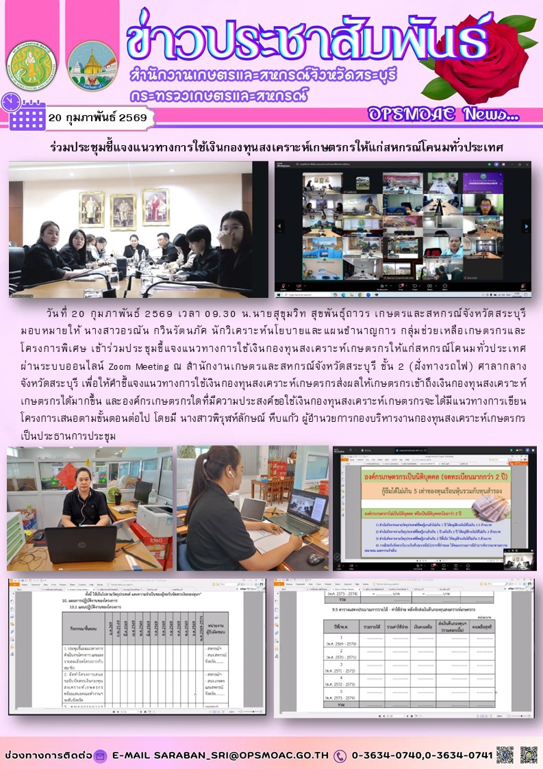 วันที่ 20 กุมภาพันธ์ 2569 เวลา 09.30 น.นายสุขุมวิท สุขพันธุ์ถาวร เกษตรและสหกรณ์จังหวัดสระบุรี มอบหมายให้ นางสาวอรณัน กวินรัตนภัค นักวิเคราะห์นโยบายและแผนชำนาญการ กลุ่มช่วยเหลือเกษตรกรและ โครงการพิเศษ เข้าร่วมประชุมชี้แจงแนวทางการใช้เงินกองทุนสงเคราะห์เกษตรกรให้แก่สหกรณ์โคนมทั่วประเทศ ผ่านระบบออนไลน์ Zoom Meeting ณ สำนักงานเกษตรและสหกรณ์จังหวัดสระบุรี ชั้น 2 (ฝั่งทางรถไฟ) ศาลากลาง จังหวัดสระบุรี เพื่อให้คำชี้แจงแนวทางการใช้เงินกองทุนสงเคราะห์เกษตรกรส่งผลให้เกษตรกรเข้าถึงเงินกองทุนสงเคราะห์เกษตรกรได้มากขึ้น และองค์กรเกษตรกรใดที่มีความประสงค์ขอใช้เงินกองทุนสงเคราะห์เกษตรกรจะได้มีแนวทางการเขียนโครงการเสนอตามขั้นตอนต่อไป โดยมี นางสาวพิรุฬห์ลักษณ์ หีบแก้ว ผู้อำนวยการกองบริหารงานกองทุนสงเคราะห์เกษตรกร เป็นประธานการประชุม