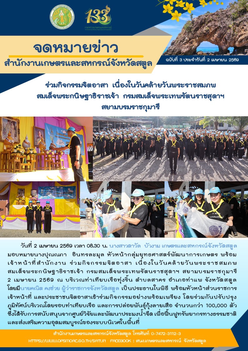 วันที่ 2 เมษายน 2569 เวลา 08.30 น. นางสาวดาวัล บัวงาม เกษตรและสหกรณ์จังหวัดสตูล มอบหมายนางปุณณภา อินทรละมุล หัวหน้ากลุ่มยุทธศาสตร์พัฒนาการเกษตร พร้อมเจ้าหน้าที่สำนักงาน ร่วมกิจกรรมจิตอาสา เนื่องในวันคล้ายวันพระราชสมภพสมเด็จพระกนิษฐาธิราชเจ้า กรมสมเด็จพระเทพรัตนราชสุดาฯ สยามบรมราชกุมารี 2 เมษายน 2569 ณ บริเวณท่าเทียบเรือทุ่งริ้น ตำบลสาคร อำเภอท่าแพ จังหวัดสตูล โดยมีนายคณิต คงช่วย ผู้ว่าราชการจังหวัดสตูล เป็นประธานในพิธี พร้อมหัวหน้าส่วนราชการ เจ้าหน้าที่ และประชาชนจิตอาสาเข้าร่วมกิจกรรมอย่างพร้อมเพรียง โดยร่วมกันปรับปรุงภูมิทัศน์บริเวณโดยรอบท่าเทียบเรือ และการปล่อยพันธุ์กุ้งลายเสือ จำนวนกว่า 100,000 ตัว ซึ่งได้รับการสนับสนุนจากศูนย์วิจัยและพัฒนาประมงน้ำจืด เพื่อฟื้นฟูทรัพยากรทางธรรมชาติและส่งเสริมความอุดมสมบูรณ์ของระบบนิเวศในพื้นที่
