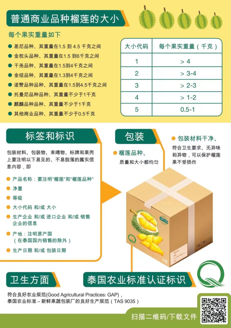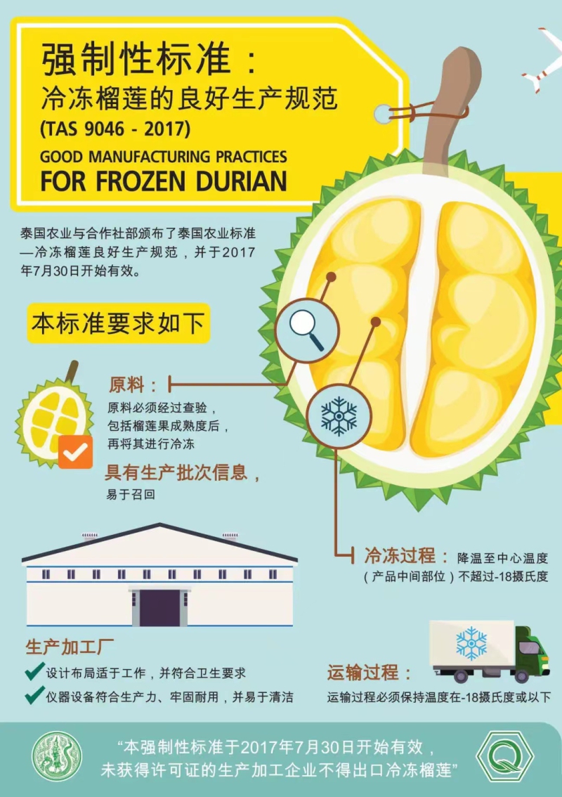 泰国榴莲的生产与加工是严格按照新冠肺炎流行病的预防措施、良好农业规范(GAP)以及良好生产规范(GMP)进行操作的。泰国榴莲质量安全可信,广大消费者可以放心购买。