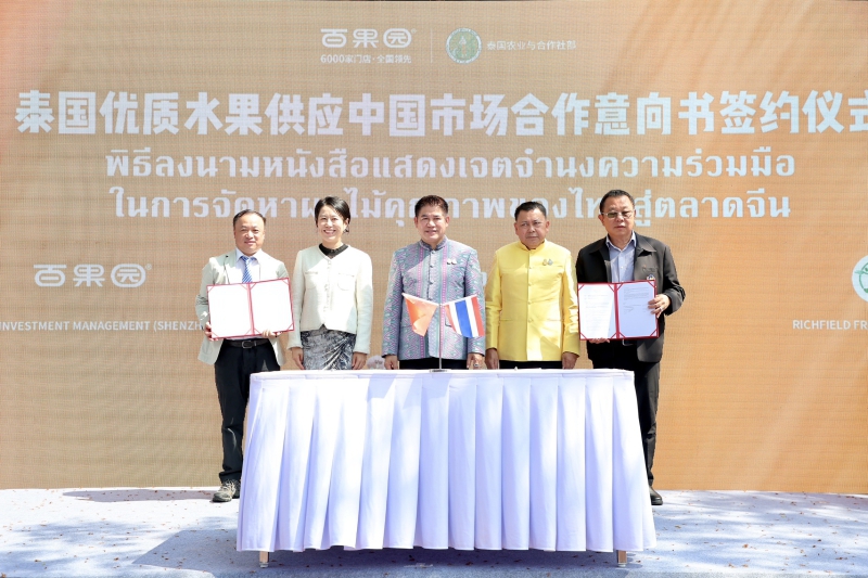 根据2024年4月22日农业部的消息报道,农业与合作社部长Thammanat Phromphao与中国驻泰大使馆商务公参张晓晓共同主持了开幕式,见证了向中国市场供应泰国优质水果合作协议的签署活动。本次活动共签署了4份文件:1) 百果园公司与农民市场组织签署的扩大农产品和消费品出口市场合作备忘录;2) 百果园公司与Richfield Fresh Fruit Co., Ltd.关于向中国市场供应优质泰国水果的合作意向书;3) 百果园公司与Sangthai Produce Co., Ltd.关于向中国市场供应泰国优质水果的合作意向书;4) 百果园公司与Fuzin Siam Fruit Co., Ltd.关于向中国市场提供泰国优质水果的合作意向书。预计签署后,将采购约13,824吨榴莲和880吨山竹,总价值16.5亿泰铢。