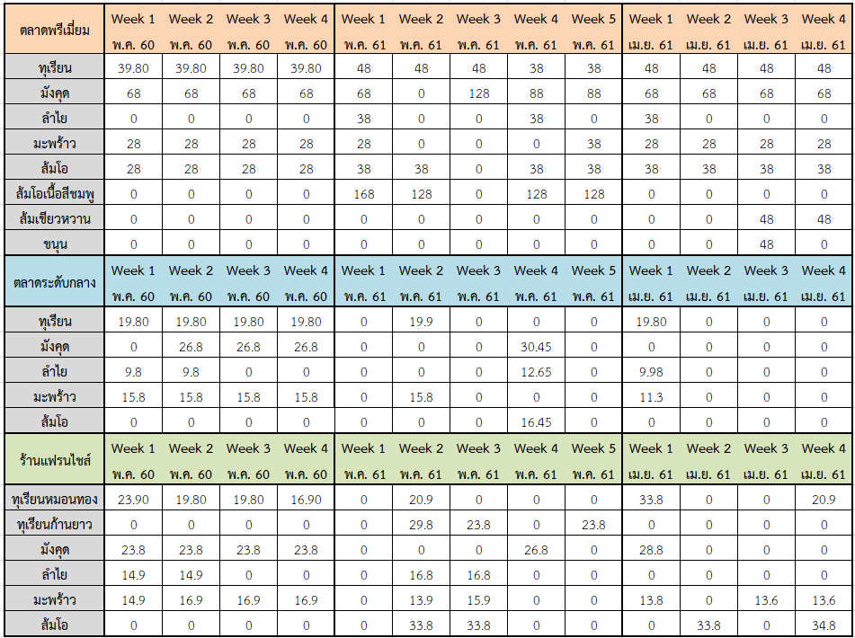 ตารางแสดงราคาการจัดจำหน่ายผลไม้ไทยในตลาดทั้ง 3 ระดับ ได้แก่ ตลาดพรี่เมี่ยม ตลาดระดับกลาง และร้านแฟรนไชส์ ปริมาณจัดจำหน่ายผลไม้เดือนพฤษภาคม 2561 มีจำนวนลดลงเมื่อเทียบกับพฤษภาคม 2560 ผลไม้หลักของไทย 4 ชนิดที่มีจัดจำหน่ายในทุกระดับตลาด คือ ทุเรียนพันธุ์หมอนทอง ลำไย มังคุด และมะพร้าว ในปี 2560 จัดจำหน่ายเกือบทุกสัปดาห์ตลอดทั้งเดือน แต่ปี 2561 จัดจำหน่ายเพียง 1 – 2 สัปดาห์ต่อเดือนเท่านั้น มีเพียงตลาดพรี่เมี่ยมที่จัดจำหน่าย ทุเรียนพันธุ์หมอนทอง และมังคุดเกือบตลอดทั้งเดือน ส่วนระดับราคาผลไม้ไทย ปี 2561 ส่วนใหญ่เพิ่มสูงขึ้นกว่า ปี 2560 โดยเฉพาะทุเรียนพันธุ์หมอนทอง มังคุด และส้มโอ ที่จัดจำหน่ายในตลาดพรี่เมี่ยม เนื่องจากผู้ประกอบการมีความเชี่ยวชาญในการเก็บรักษาผลไม้และมีบรรจุภัณฑ์ที่สวยงาม