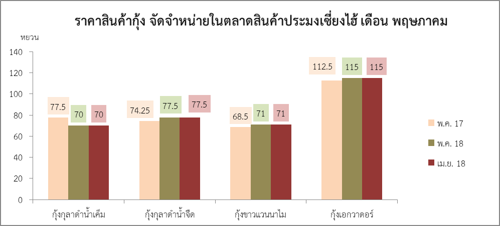 ราคากุ้งกุลาดำน้ำจืด กุ้งขาวแวนาไม และกุ้งเอกวาดอร์ของเดือนพฤษภาคม 2561 ปรับตัวเพิ่มขึ้น 3.25 หยวน 2.5 หยวน และ 2.5 หยวน ตามลำดับ แต่ราคากุ้งกุลาดำน้ำเค็มกลับลดลง 6.5 หยวน หากพิจารณาราคากุ้งของพ.ค และ เม.ย 2561 พบว่า ราคาสินค้ากุ้งทุกตัวคงที่ไม่มีการเปลี่ยนแปลง