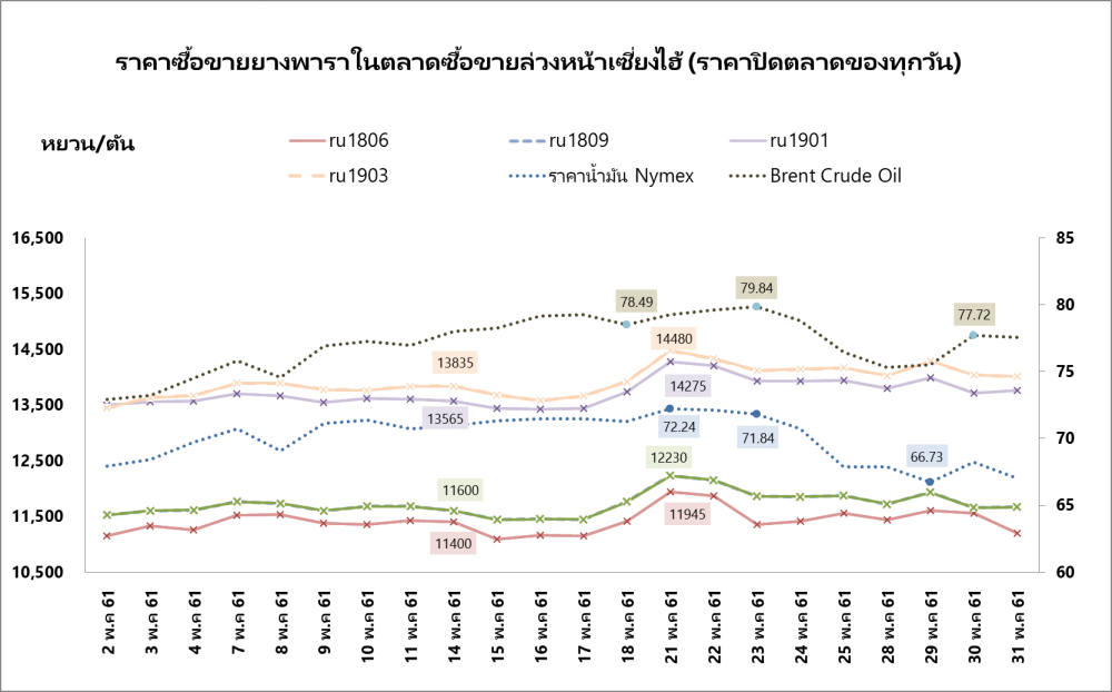ราคาซื้อขายยางพาราในตลาดล่วงหน้าของทุกรอบการส่งมอบมีแนวโน้มราคาเริ่มปรับตัวสูงขึ้นกว่าเดือนเมษายน จากกราฟจะเห็นว่า ตั้งแต่ช่วงกลางเดือนพฤษภาคม ราคายางพาราเพิ่มขึ้นอย่างรวดเร็ว มีสาเหตุมาจากการควบคุมการส่งออกยางพาราของไทย อินโดนีเซีย และมาเลเซียช่วงที่ผ่านมา และกลุ่มผู้ผลิตน้ำมันยังคงปรับลดกำลังผลิตและสหรัฐอเมริกาต้องการคว่ำบาตรอิหร่านส่งผลให้ปริมาณการผลิตน้ำมันดิบของอิหร่านลดลง 7.5 ล้าน บาร์เรลต่อเดือน ทำให้ปริมาณน้ำมันดิบคงคลังโลกมีแนวโน้มปรับตัวลดลงอย่างต่อเนื่อง ดังนั้นราคาน้ำมันดิบปรับตัวเพิ่มสูงขึ้น ประกอบกับสหรัฐอเมริกาและจีนประกาศยกเลิกสงครามทางการค้าชั่วคราว