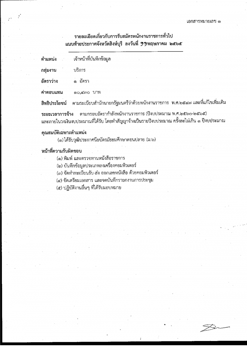 สำนักงานเกษตรและสหกรณ์จังหวัดสิงห์บุรี เปิดรับสมัครเพื่อเลือกสรรเป็นพนักงานราชการทั่วไป ตำแหน่ง เจ้าหน้าที่บันทึกข้อมูล สามารถยื่นใบสมัครได้ด้วยตนเอง ตั้งแต่วันที่ 23 - 27 พฤษภาคม 2565 ณ สำนักงานเกษตรและสหรกรณ์จังหวัดสิงห์บุรี ชั้น 3 (หลังเก่า)