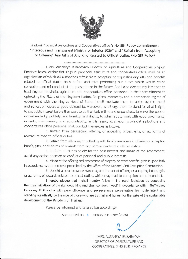 ประกาศเจตนารมณ์ เรื่อง “สุจริต โปร่งใส สำนักงานเกษตรและสหกรณ์จังหวัดสิงห์บุรี ใสสะอาด 2569” และ “งดรับ งดให้” ของขวัญ ของกำนัลทุกชนิดจากการปฏิบัติหน้าที่ (No Gift Policy)