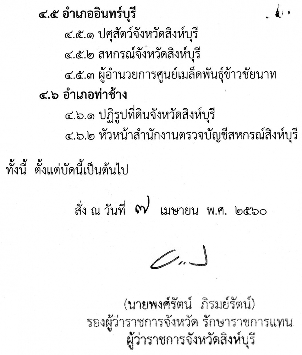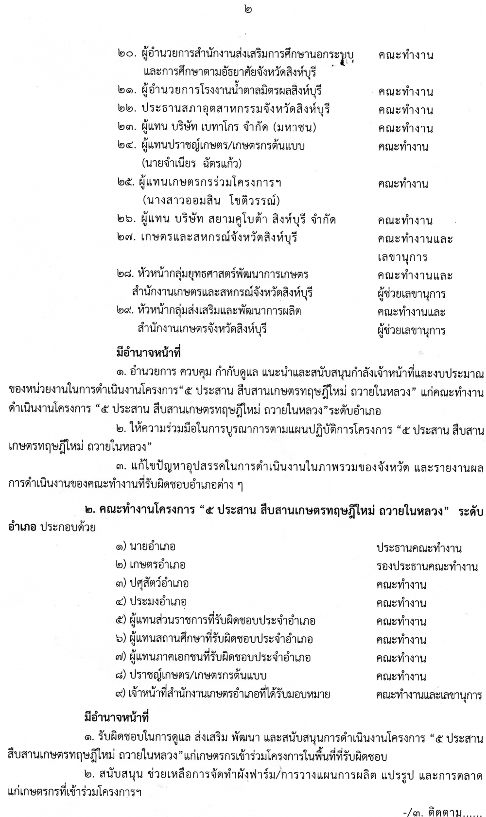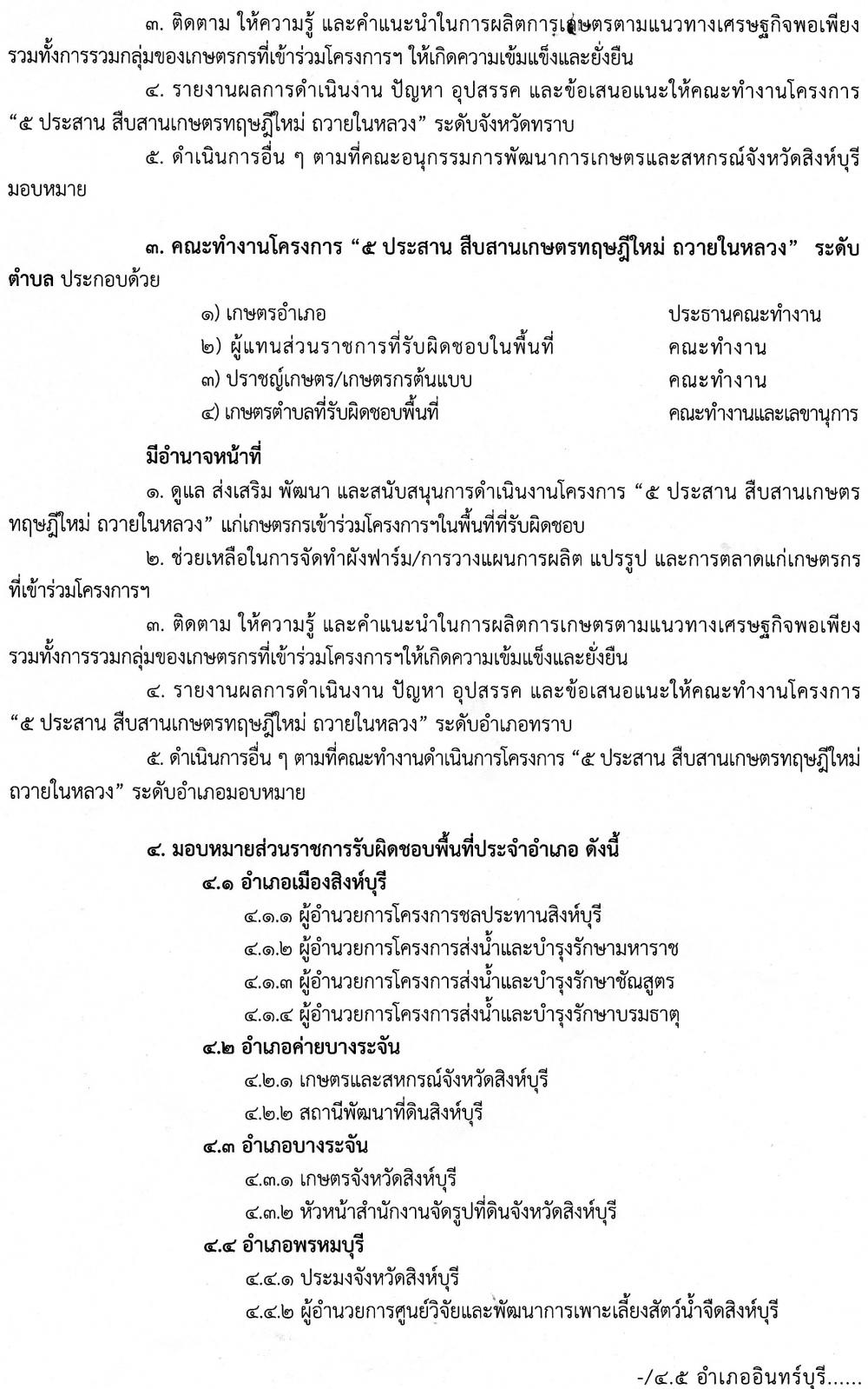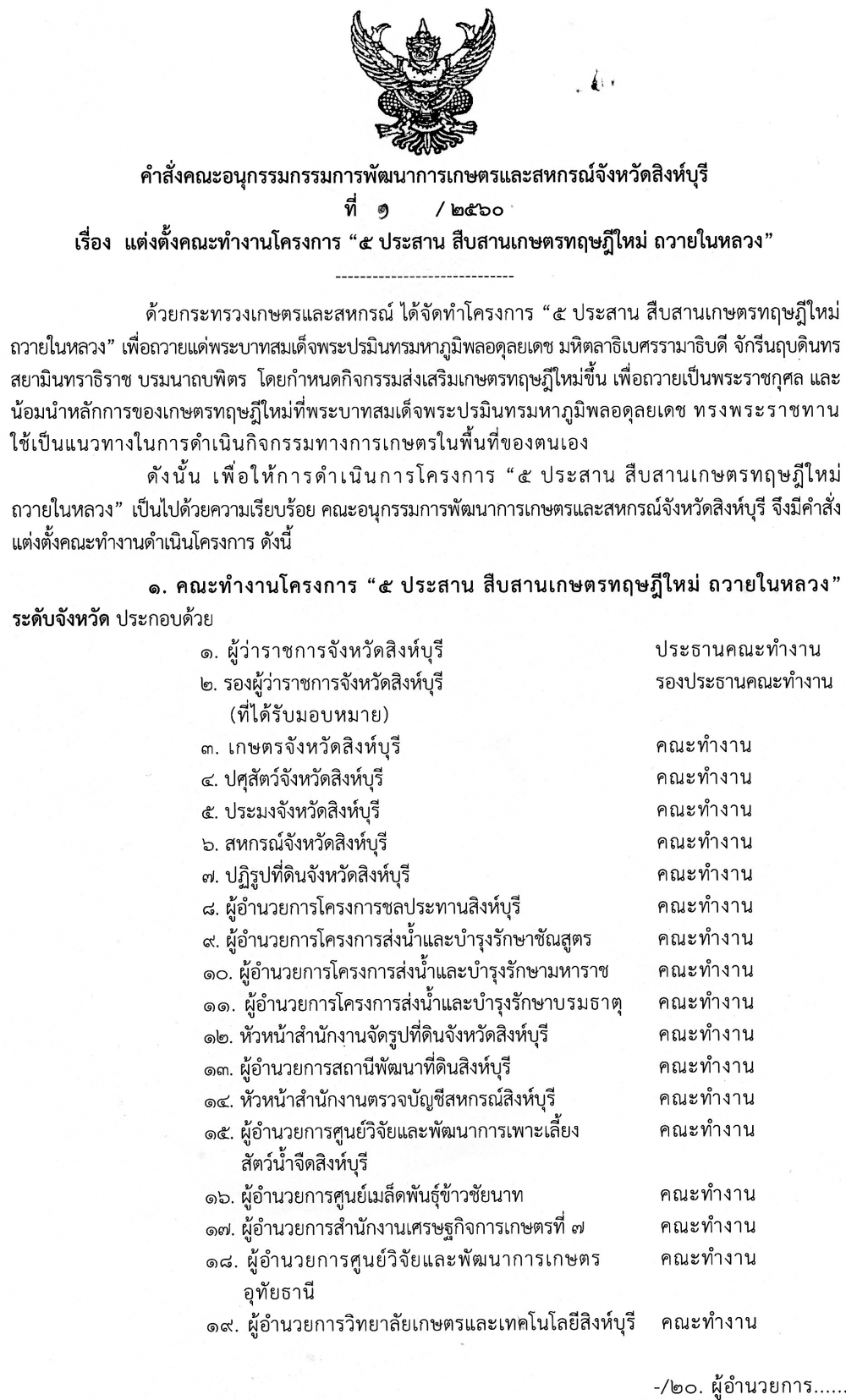 คำสั่งคณะอนุกรรมการพัฒนาการเกษตรและสหกรณ์จังหวัดสิงห์บุรี ที่ 1/2560 เรื่องแต่งตั้งคณะทำงานโครงการ "5ประสาน สืบสานเกษตรทฤษฎีใหม่ ถวายในหลวง" ลงวันที่ 7 เมษายน 2560