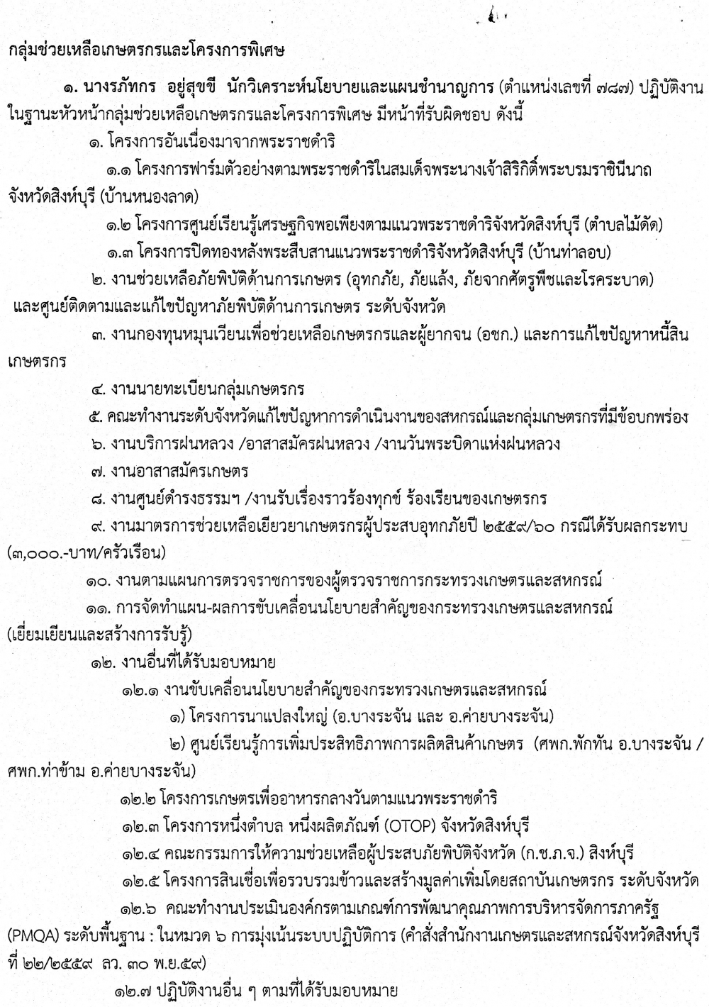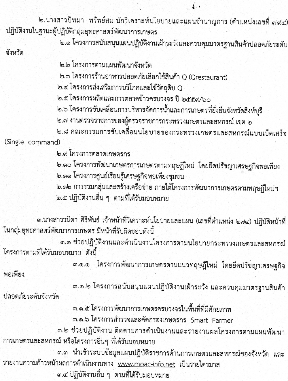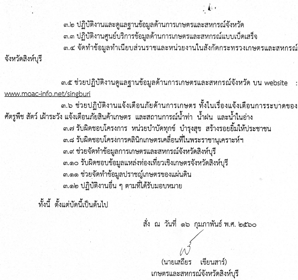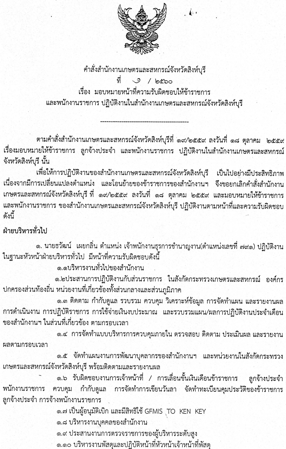 คำสั่งสำนักงานเกษตรและสหกรณ์จังหวัดสิงห์บุรีที่ 1/2560 เรื่อง มอบหมายหน้าที่ความรับผิดชอบให้ข้าราชการและพนักงานราชการปฏิบัติงานในสำนักงานเกษตรและสหกรณ์จังหวัดสิงห์บุรี ลงวันที่ 16 กุมภาพันธ์ 2560