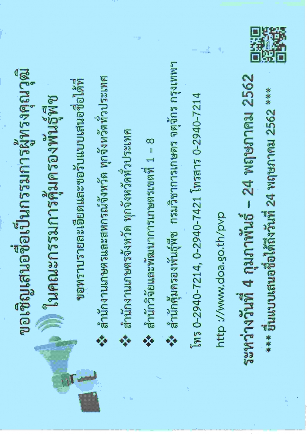 ด้วยกรมวิชาการเกษตร ได้ออกประกาศกรมวิชาการเกษตรเรื่อง กำหนด วัน เวลา สถานที่ในการสรรหากรรมการผู้ทรงคุณวุฒิในคณะกรรมการคุ้มครองพันธุ์พืช ตามพระราชบัญญัติคุ้มครองพันธุ์พืช พ.ศ. 2542 (พ.ศ.2562) เพื่อดำเนินการสรรหากรรมการผู้ทรงคุณวุฒิในคณะกรรมการคุ้มครองพันธุ์พืชตามพระราชบัญญัติคุ้มครองพันธุ์พืช พ.ศ. 2542 แทนกรรมการผู้ทรงคุณวุฒิชุดเดิมที่จะครบวาระการดำรงตำแหน่งในวันที่ 7 สิงหาคม 2562สำนักงานเกษตรและสหกรณ์จังหวัดสิงห์บุรีขอประชาสัมพันธ์ การสรรหากรรมการผู้ทรงคุณวุฒิในคณะกรรมการคุ้มครองพันธุ์พืช ตามพระราชบัญญัติคุ้มครองพันธุ์พืช พ.ศ. 2542 (พ.ศ.2562) ให้ผู้ที่สนใจขอรับแบบเสนอชื่อพร้อมแบบประวัติได้ที่สำนักงานเกษตรและสหกรณ์จังหวัดสิงห์บุรี หรือสำนักงานเกษตรจังหวัดสิงห์บุรี ระหว่างวันที่ 1 กุมภาพันธ์ 2562 ถึงวันที่ 24 พฤษภาคม 2562 ในวันเวลาราชการ