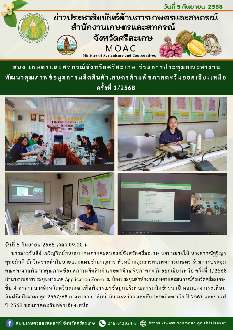 นางสาววันลีย์ เจริญวิทย์ธนเดช เกษตรและสหกรณ์จังหวัดศรีสะเกษ มอบหมายให้ นางสาวณัฐฐิญา สุทธภักดี นักวิเคราะห์นโยบายและแผนชำนาญการ หัวหน้ากลุ่มสารสนเทศการเกษตร ร่วมการประชุมคณะทำงานพัฒนาคุณภาพข้อมูลการผลิตสินค้าเกษตรด้านพืชภาคตะวันออกเฉียงเหนือ ครั้งที่ 1/2568 ผ่านระบบการประชุมทางไกล Application Zoom  ณ ห้องประชุมสำนักงานเกษตรและสหกรณ์จังหวัดศรีสะเกษ ชั้น 4 ศาลากลางจังหวัดศรีสะเกษ เพื่อพิจารณาข้อมูลปริมาณการผลิตข้าวนาปี หอมแดง กระเทียม มันฝรั่ง ปีเพาะปลูก 2567/68 ยางพารา ปาล์มน้ำมัน มะพร้าว และสับปะรดปัตตาเวีย ปี 2567 และกาแฟ ปี 2568 ของภาคตะวันออกเฉียงเหนือ