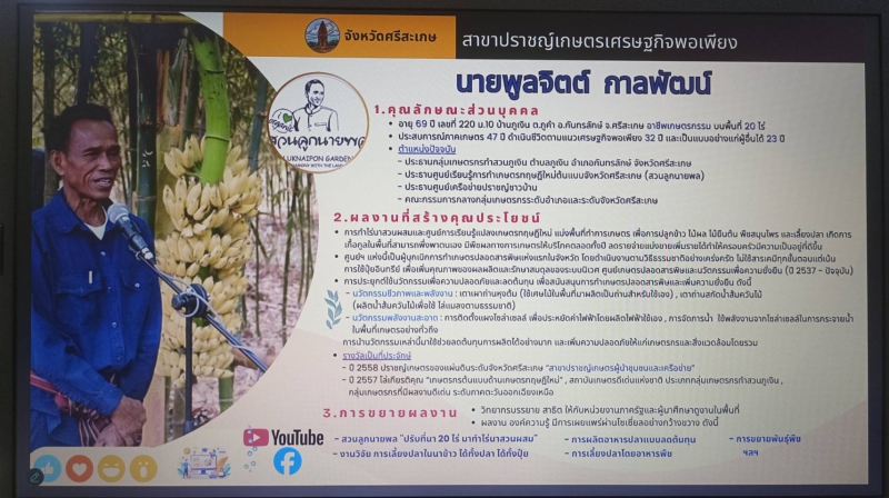 จังหวัดศรีสะเกษ ได้นำเสนอผลงานของผู้เข้าร่วมสรรหาปราชญ์เกษตรของแผ่นดินที่ผ่านการคัดเลือกในระดับจังหวัด จำนวน 2 สาขา ได้แก่ 1) สาขาปราชญ์เกษตรเศรษฐกิจพอเพียง นายพูลจิตต์ กาลพัฒน์ 2) สาขาปราชญ์เกษตรผู้นำชุมชนและเครือข่าย นายวิรัตน์ ชูเพชร