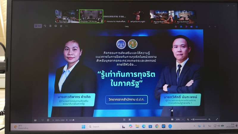 นางสาววันลีย์ เจริญวิทย์ธนเดช เกษตรและสหกรณ์จังหวัดศรีสะเกษ มอบหมายให้ นางสาวพักตร์วิภา พรหมมานนท์ เจ้าพนักงานการเงินและบัญชีชำนาญงาน หัวหน้าฝ่ายบริหารทั่วไป พร้อมด้วย นางสาวกนกวรรณ บุราคร เจ้าพนักงานธุรการชำนาญงาน นางสาวชนานันท์ มันธุภา เจ้าหน้าที่บริหารงานทั่วไป และนางสาวยลดา ชิวหาทองคำ เจ้าหน้าที่ธุรการ ร่วมกิจกรรมการส่งเสริมและให้ความรู้แนวทางในการป้องกันการทุจริตในหน่วยงานสำหรับบุคลากรกระทรวงเกษตรและสหกรณ์ ภายใต้หัวข้อ “รู้เท่าทันการทุจริตในภาครัฐ” ประจำปีงบประมาณ พ.ศ. 2569 ผ่านระบบการประชุมทางไกลออนไลน์ Zoom Meeting ณ ห้องประชุมสำนักงานเกษตรและสหกรณ์จังหวัดศรีสะเกษ ชั้น 4 ศาลากลางจังหวัดศรีสะเกษ