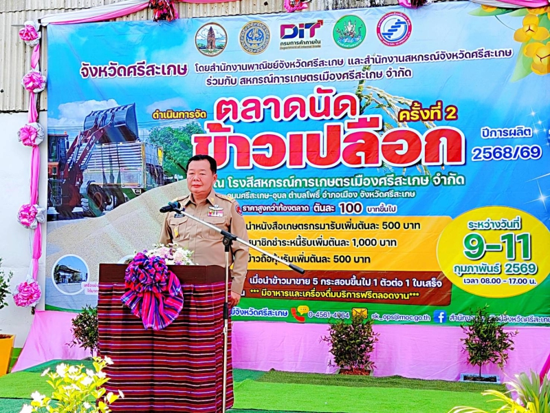 สำนักงานพาณิชย์จังหวัดศรีสะเกษ ร่วมกับ สหกรณ์การเกษตรเมืองศรีสะเกษ จำกัด ดำเนินโครงการจัดตลาดนัดข้าวเปลือก ปีการผลิต 2568/69 ครั้งที่ 2 ในระหว่างวันที่ 9 – 11 กุมภาพันธ์ 2569 โดยมี นายธาตรี สิริรุ่งวนิช รองผู้ว่าราชการจังหวัดศรีสะเกษ เป็นประธานในพิธีเปิดงาน โดยมีวัตถุประสงค์เพื่อให้กลไกตลาดในการรับซื้อข้าวเปลือกจากเกษตรกรมีการแข่งขัน เกษตรกรมีช่องทางเลือกและมีอำนาจต่อรองในการขายมากขึ้น รวมทั้งส่งเสริมการซื้อขายข้าวเปลือกให้เกิดความเป็นธรรมทั้งด้านราคา การชั่งน้ำหนัก และการตรวจสอบคุณภาพ