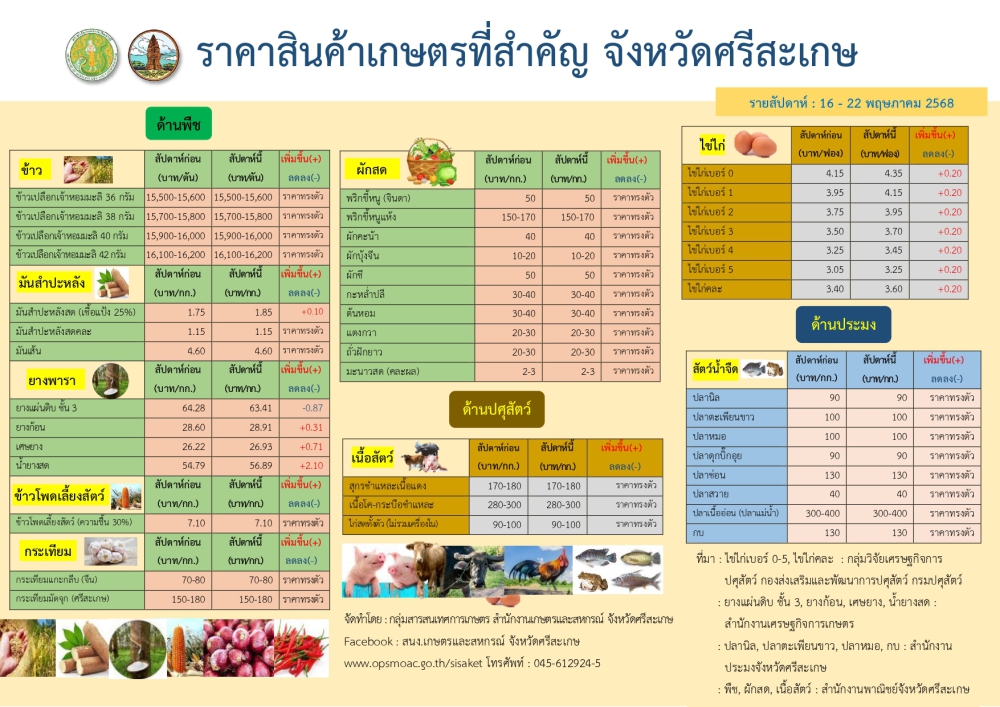 ราคาสินค้าเกษตรที่สำคัญจังหวัดศรีสะเกษ รายสัปดาห์ : 16 - 22 พฤษภาคม 2568