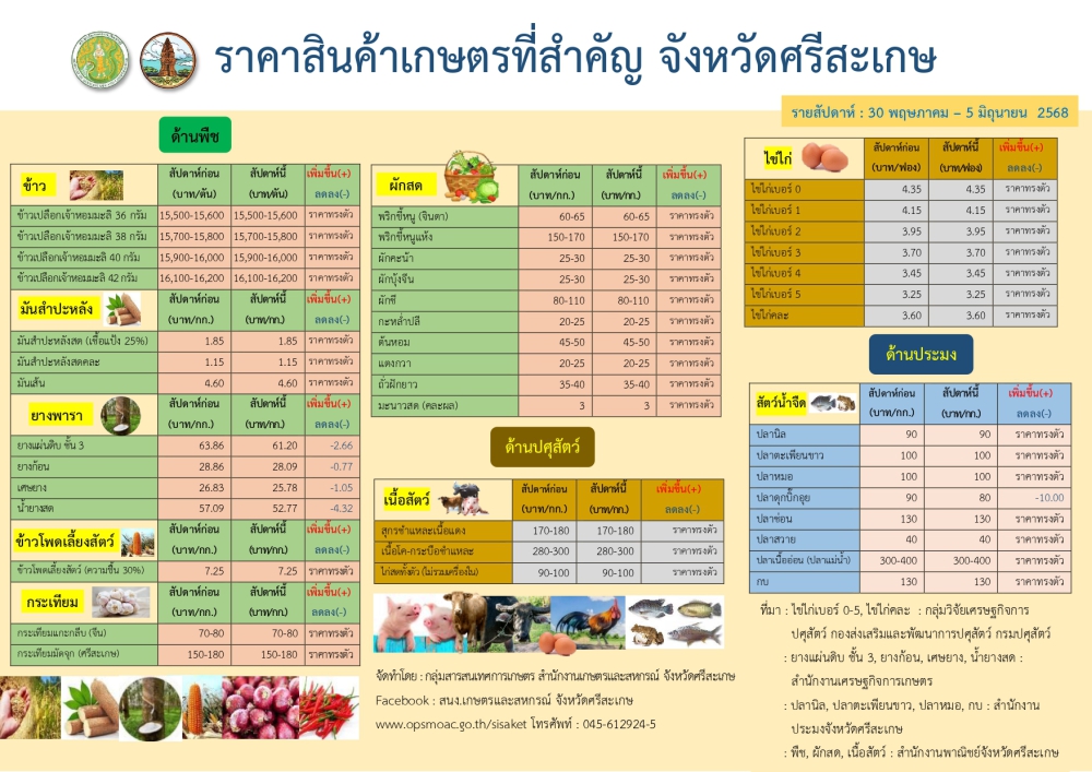 ราคาสินค้าเกษตรที่สำคัญจังหวัดศรีสะเกษ รายสัปดาห์ : 30 พฤษภาคม - 5 มิถุนายน 2568