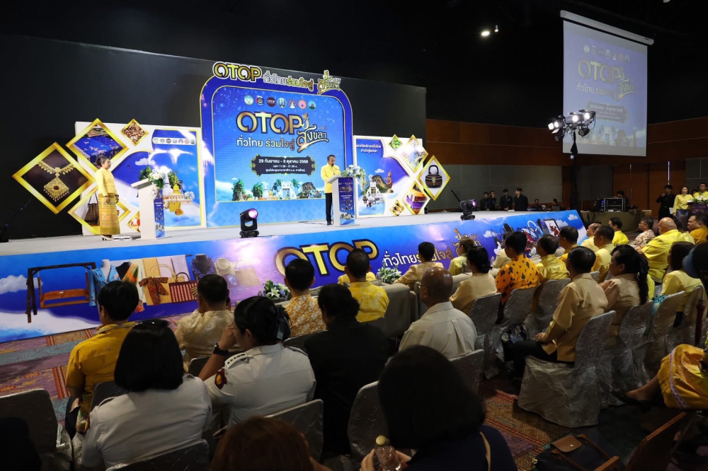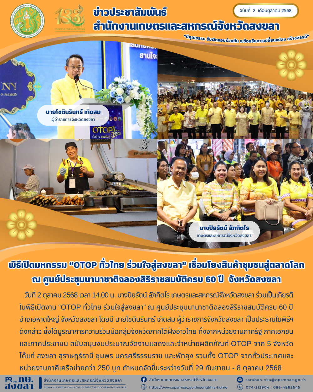 วันที่ 2 ตุลาคม 2568 เวลา 14.00 น. นางปิยรัตน์ ลัภกิตโร เกษตรและสหกรณ์จังหวัดสงขลา ร่วมเป็นเกียรติในพิธีเปิดงาน “OTOP ทั่วไทย ร่วมใจสู่สงขลา” ณ ศูนย์ประชุมนานาชาติฉลองสิริราชสมบัติครบ 60 ปี อำเภอหาดใหญ่ จังหวัดสงขลา โดยมี นายโชตินรินทร์ เกิดสม ผู้ว่าราชการจังหวัดสงขลา เป็นประธานในพิธีฯ ดังกล่าว ซึ่งได้บูรณาการความร่วมมือกลุ่มจังหวัดภาคใต้ฝั่งอ่าวไทย ทั้งจากหน่วยงานภาครัฐ ภาคเอกชน และภาคประชาชน สนับสนุนงบประมาณจัดงานแสดงและจำหน่ายผลิตภัณฑ์ OTOP จาก 5 จังหวัด ได้แก่ สงขลา สุราษฎร์ธานี ชุมพร นครศรีธรรมราช และพัทลุง รวมทั้ง OTOP จากทั่วประเทศ และหน่วยงานภาคีเครือข่ายกว่า 250 บูท กำหนดจัดขึ้นระหว่างวันที่ 29 กันยายน - 8 ตุลาคม 2568