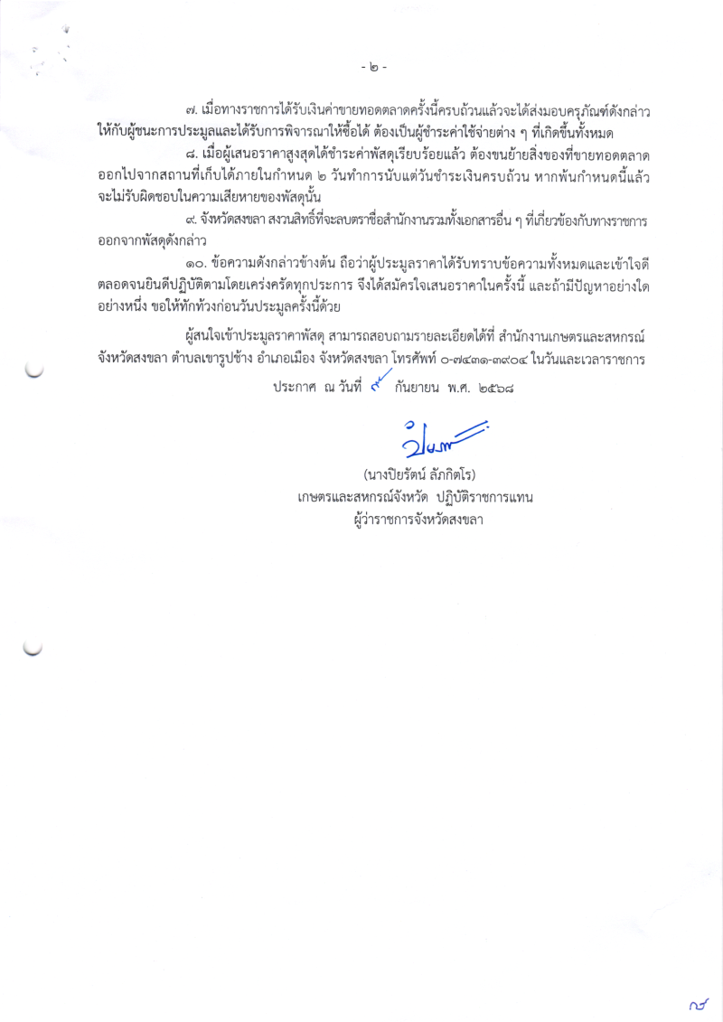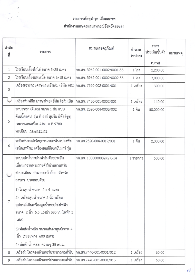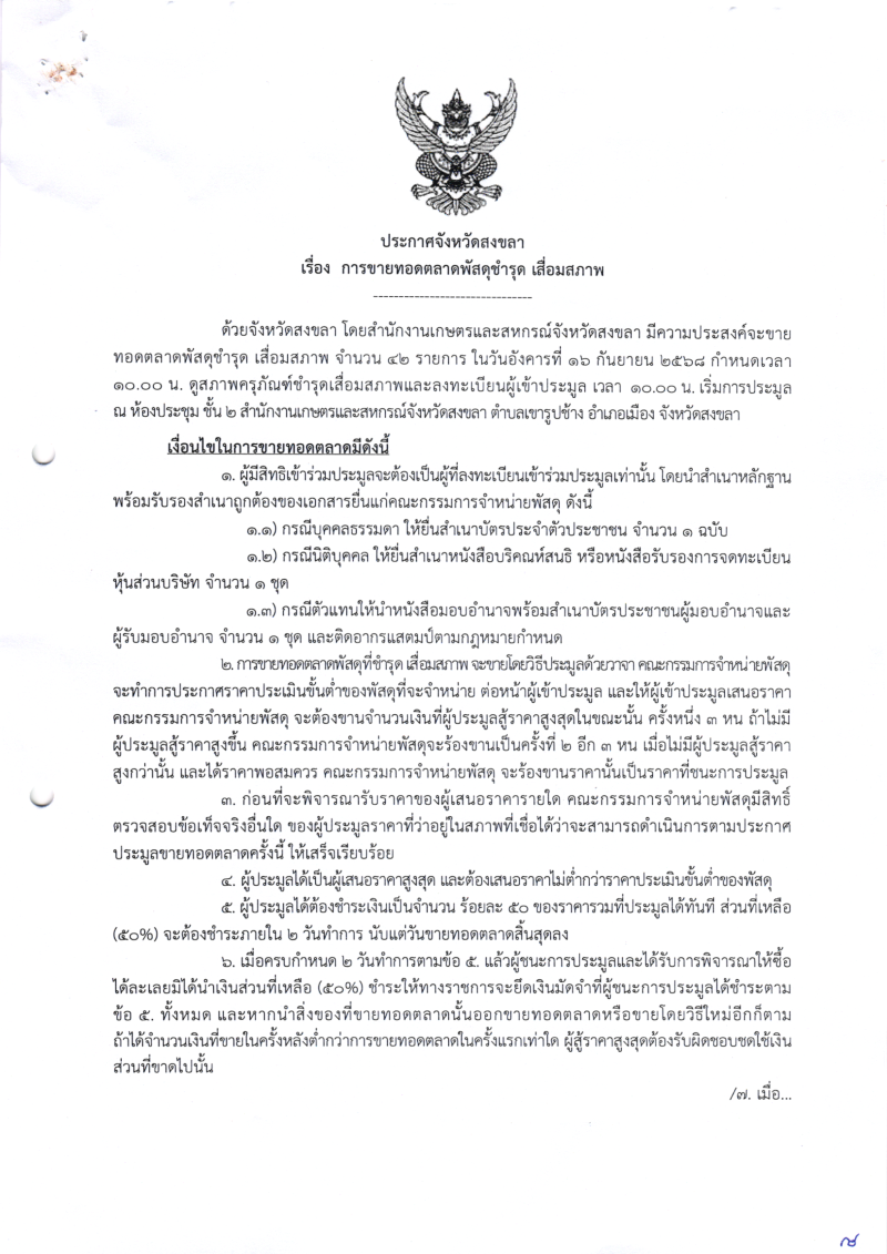 ด้วยจังหวัดสงขลา โดยสำนักงานเกษตรและสหกรณ์จังหวัดสงขลา มีความประสงค์จะขาย ทอดตลาดพัสดุชำรุด เสื่อมสภาพ จำนวน 42 รายการ ในวันอังคารที่ 16 กันยายน2568 กำหนดเวลา 10.00 น. ดูสภาพครุภัณฑ์ชำรุดเสื่อมสภาพและลงทะเบียนผู้เข้าประมูล เวลา 10.00 น. เริ่มการประมูล ณ ห้องประชุม ชั้น 2 สำนักงานเกษตรและสหกรณ์จังหวัดสงขลา ตำบลเขารูปช้าง อำเภอเมือง จังหวัดสงขลา
