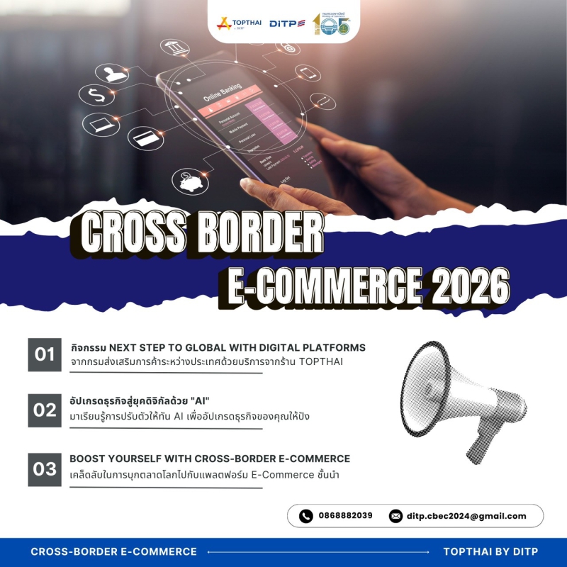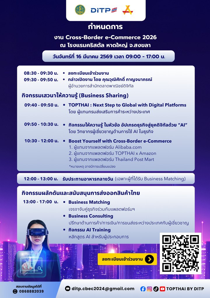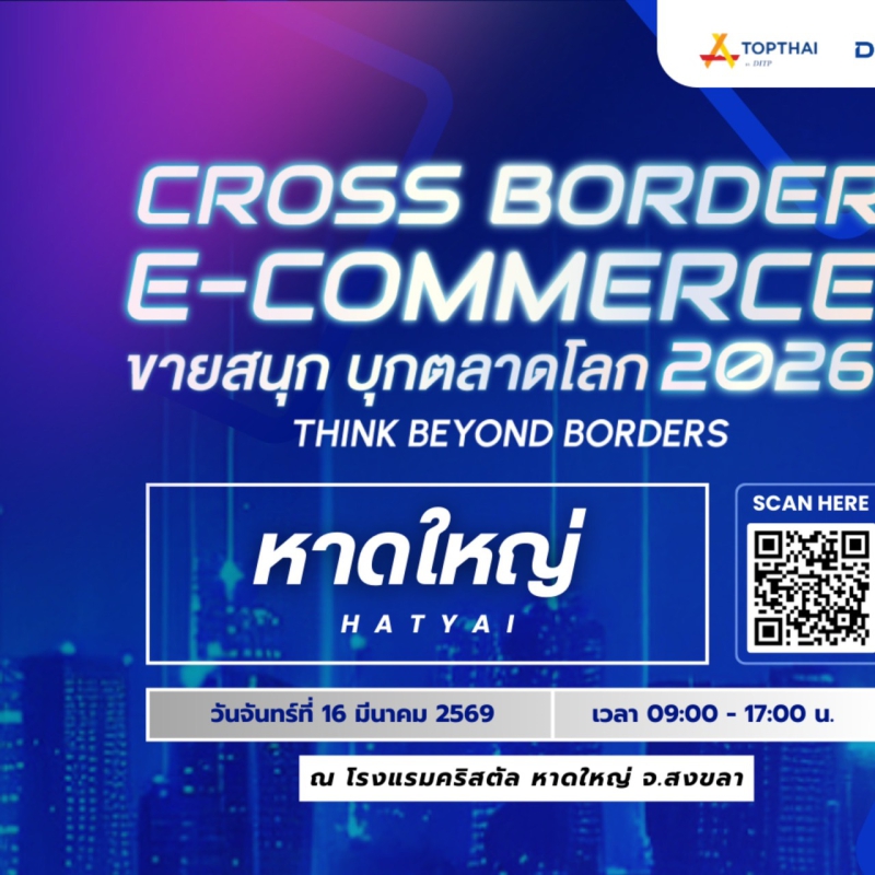 ?กลับมาอีกครั้ง กับโครงการที่จะพาผู้ประกอบการไทยมาขายสนุกบุกตลาดโลก กับงาน Cross-Border e-Commerce 2026 ?? . ? DITP ยกทัพแพลตฟอร์มระดับโลก ครั้งนี้เราบุกไปหาผู้ประกอบการภาคใต้ ที่หาดใหญ่ จังหวัดสงขลา อย่าพลาดโอกาสทองในการอัปสกิลธุรกิจให้ไปไกลถึงตลาดโลก ? . ? ไฮไลท์กิจกรรมภายในงาน : ? ขายออนไลน์ไปตลาดโลกกับโครงการ TOPTHAI ? อัปเกรดธุรกิจด้วย AI & Digital Tools จากผู้เชี่ยวชาญ ? Business Matching กับแพลตฟอร์มชั้นนำ ( Alibaba.com, TOPTHAI x Amazon, e-Bay และ Thailand Post Mart) ? Business Consulting ด้านการค้า การเงิน การขนส่งระหว่างประเทศ . ? วันที่ : วันจันทร์ที่ 16 มีนาคม 2569 (2026) ⏰ เวลา : 09.30 - 17.00 น. ? สถานที่จัด ห้องคิงส์ตัน ชั้น 5 โรงแรม คริสตัล หาดใหญ่ . ? จัดโดย… กรมส่งเสริมการค้าระหว่างประเทศ (DITP) กระทรวงพาณิชย์ ? เข้าร่วมฟรี! (รับจำนวนจำกัด) ?? ลงทะเบียนร่วมงานได้ที่ : ? สอบถาม/ติดตามข่าวสารเพิ่มเติมได้ที่: ? www.thaitrade.com/topthai ? Facebook: ThaiTrade.com TopThai by DITP ? Instagram TikTok: TopThaibyDITP ☎️ โทร: 086-888-2039 / 062-457-0901 #DITP #TopThaiStore #ขายสนุกบุกตลาดโลก