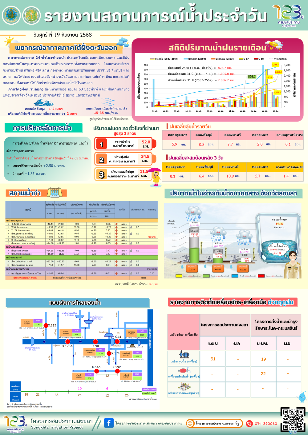 รายงานสถานการณ์น้ำ โครงการชลประทานสงขลา ประจำวันที่ 19 กันยายน 2568ที่มา : โครงการชลประทานสงขลา สำนักงานชลประทาน ที่ 16
