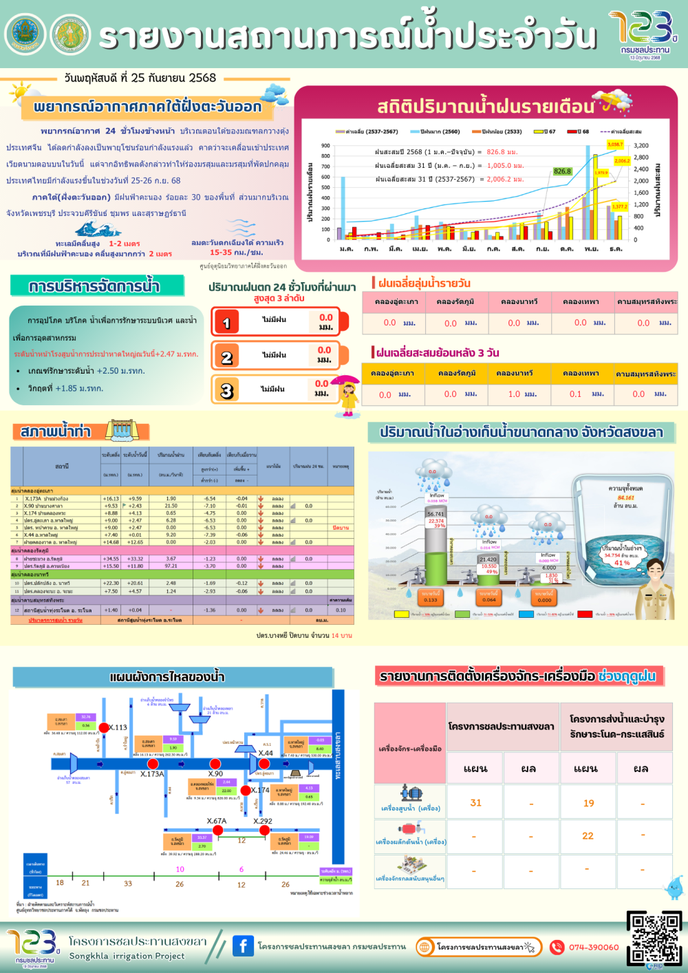 รายงานสถานการณ์น้ำ โครงการชลประทานสงขลา ประจำวันที่ 25 กันยายน 2568ที่มา : โครงการชลประทานสงขลา สำนักงานชลประทาน ที่ 16