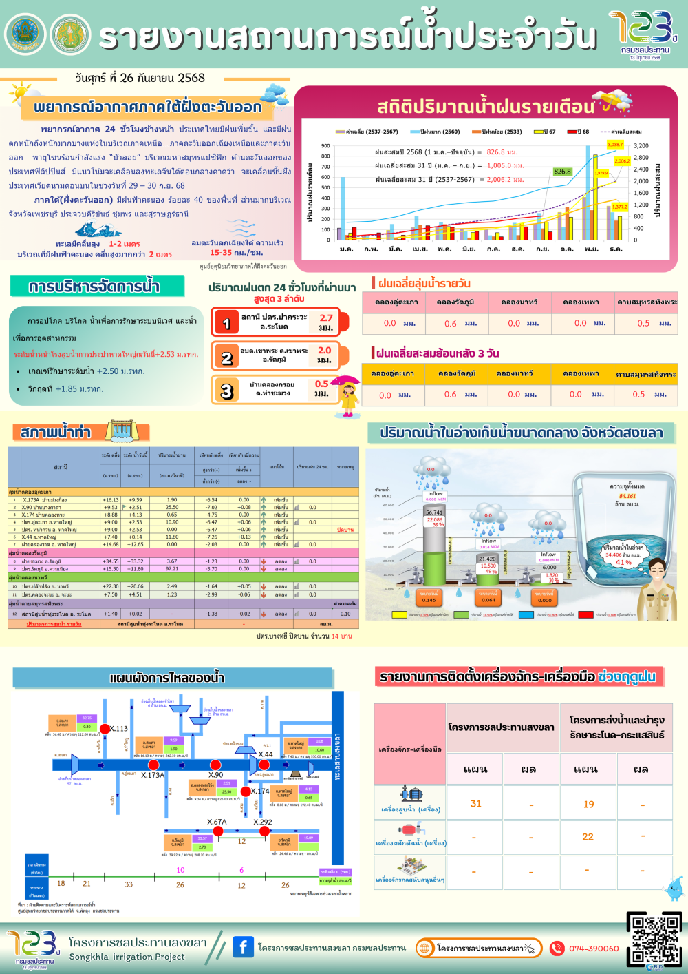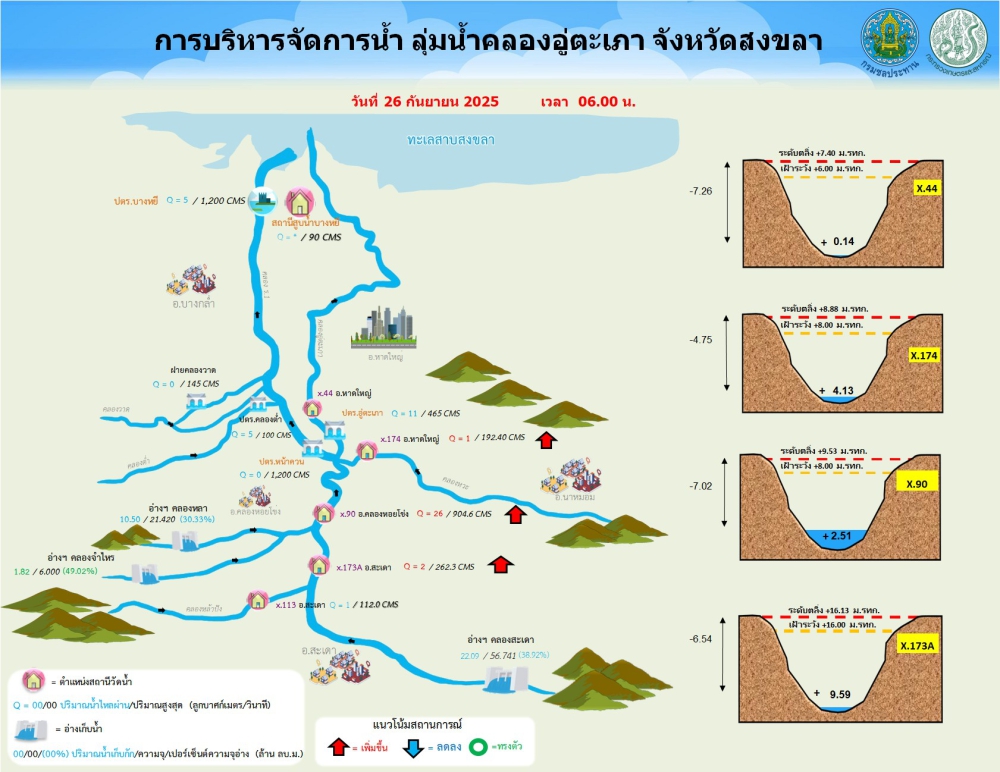 รายงานสถานการณ์น้ำ โครงการชลประทานสงขลา ประจำวันที่ 26 กันยายน 2568ที่มา : โครงการชลประทานสงขลา สำนักงานชลประทาน ที่ 16