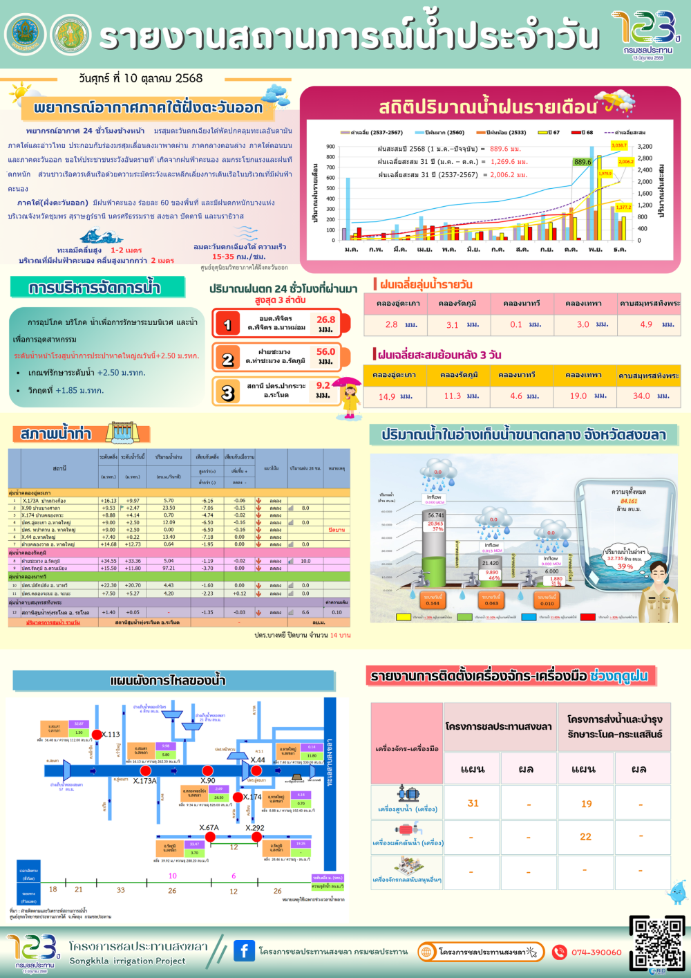 รายงานสถานการณ์น้ำ โครงการชลประทานสงขลา ประจำวันที่ 10 ตุลาคม 2568ที่มา : โครงการชลประทานสงขลา สำนักงานชลประทาน ที่ 16