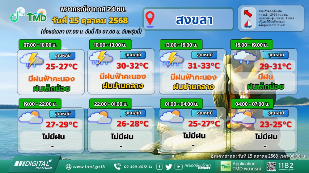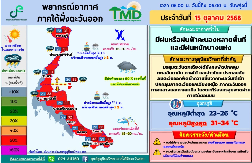 พยากรณ์อากาศภาคใต้ฝั่งตะวันออก ประจำวันที่ 15 ตุลาคม 2568เวลา 06.00 น. วันนี้ถึง 06.00 น. วันพรุ่งนี้ที่มา : ศูนย์อุตุนิยมวิทยาภาคใต้ฝั่งตะวันออก