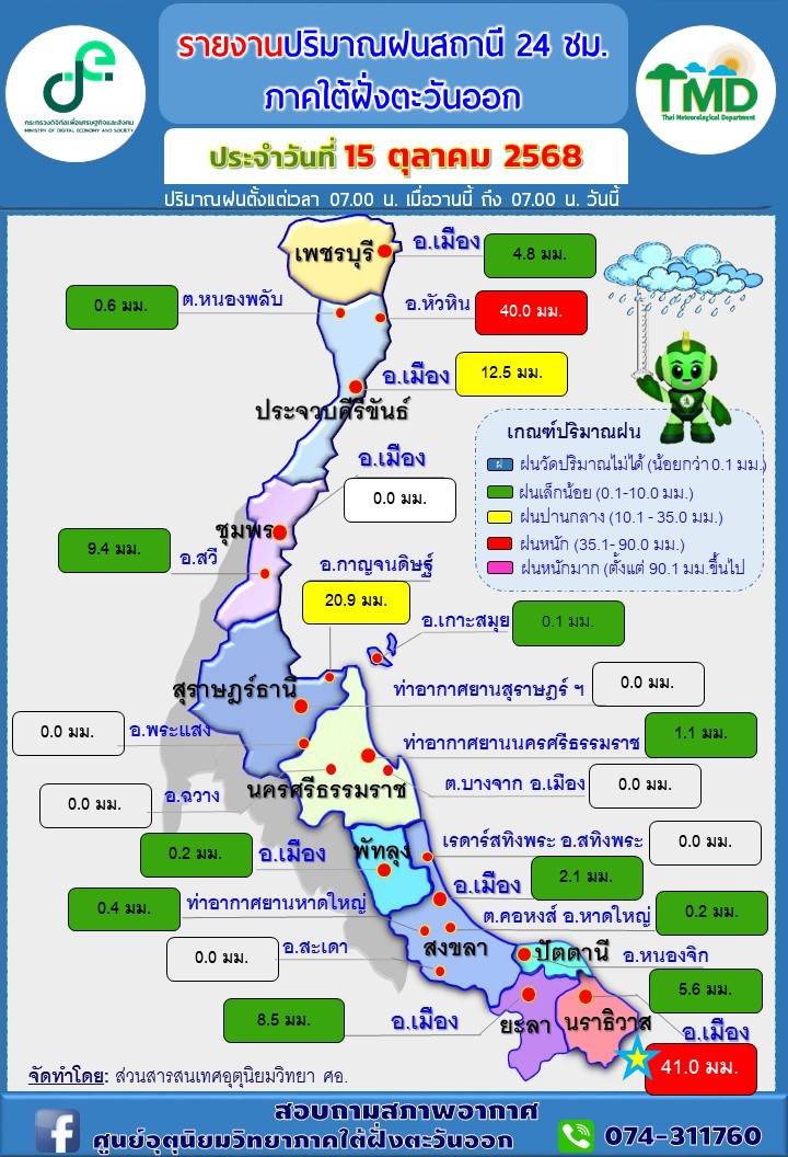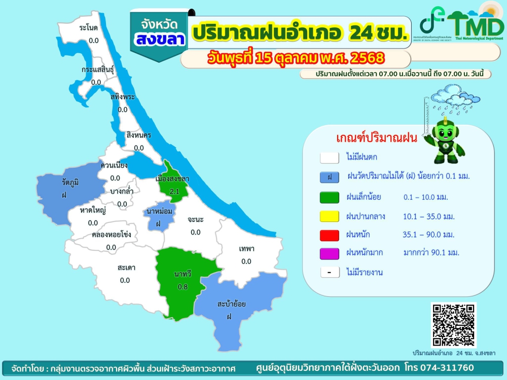 รายงานปริมาณฝนอำเภอ 24 ชม. จังหวัดสงขลา วันที่ 15 ตุลาคม 2568ปริมาณฝนตั้งแต่เวลา 07.00 น.เมื่อวานนี้ ถึง 07.00 น. วันนี้ที่มา : ศูนย์อุตุนิยมวิทยาภาคใต้ฝั่งตะวันออก