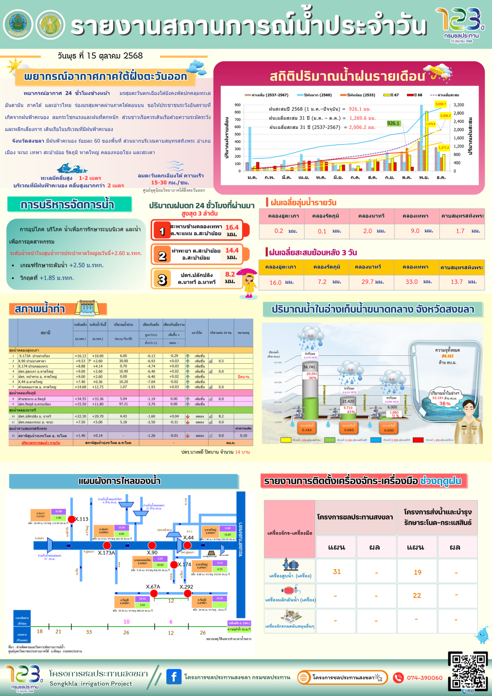 รายงานสถานการณ์น้ำ โครงการชลประทานสงขลา ประจำวันที่ 15 ตุลาคม 2568ที่มา : โครงการชลประทานสงขลา สำนักงานชลประทาน ที่ 16