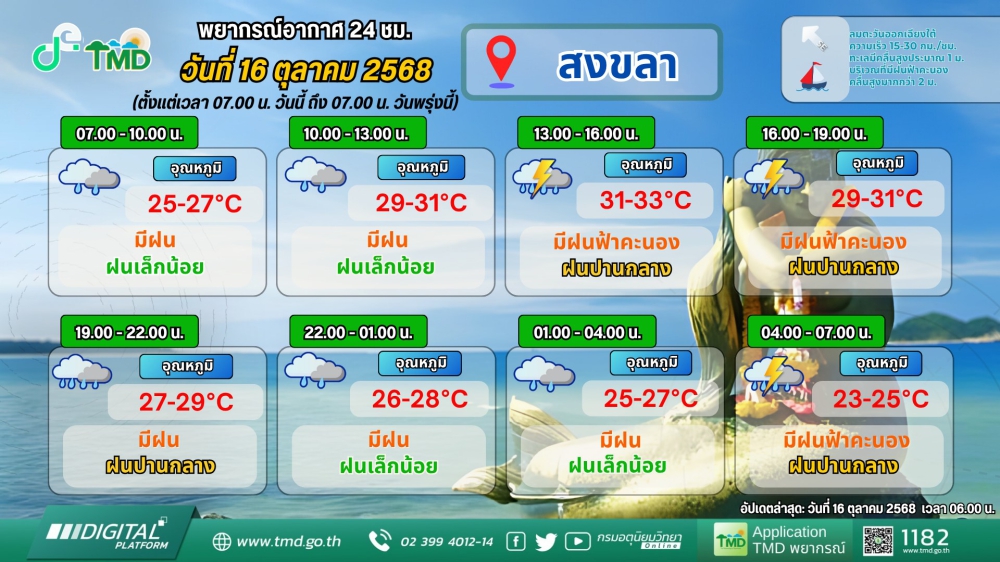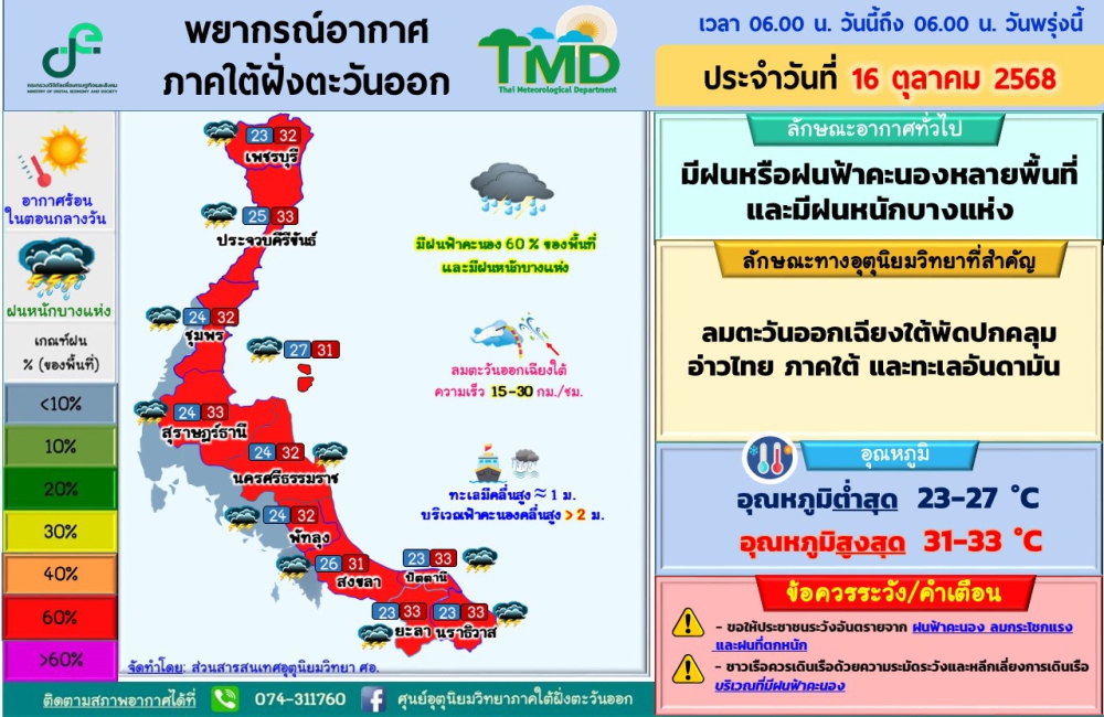 พยากรณ์อากาศภาคใต้ฝั่งตะวันออก ประจำวันที่ 16 ตุลาคม 2568เวลา 06.00 น. วันนี้ถึง 06.00 น. วันพรุ่งนี้ที่มา : ศูนย์อุตุนิยมวิทยาภาคใต้ฝั่งตะวันออก